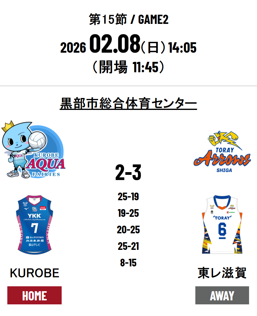 KUROBE Aqua Fairies 2 - 3 Toray Arrows Shiga