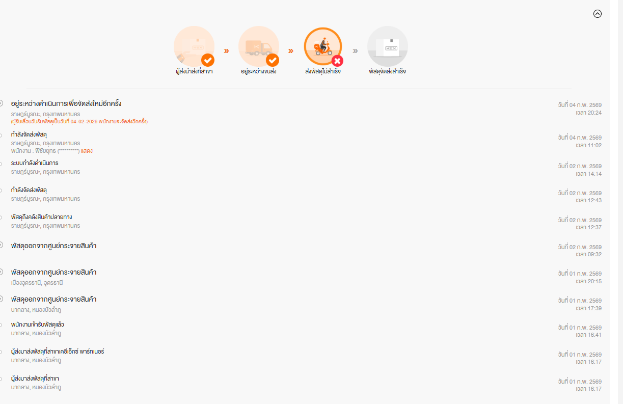 คือกำหนดส่ง : 03 ก.พ. แต่มาส่งจริง 04 ก.พ. แต่พนักงานหาบ้านไม่เจอเลยเลื่อนไปส่ง 05 ก.พ. ปัจจุบันก็ยังไม่มาส่งสักทีเลยไปตามของเองที่คลังราษฎร์บูรณะ สรุปหาของไม่เจออีกพนักงานลืมเอาของกลับคลังประมาณนั้น แล้วคือทำอะไรได้นอกจากรอโทรหา call center ก็ดูจะไม่ได้ดีขึ้นเลย