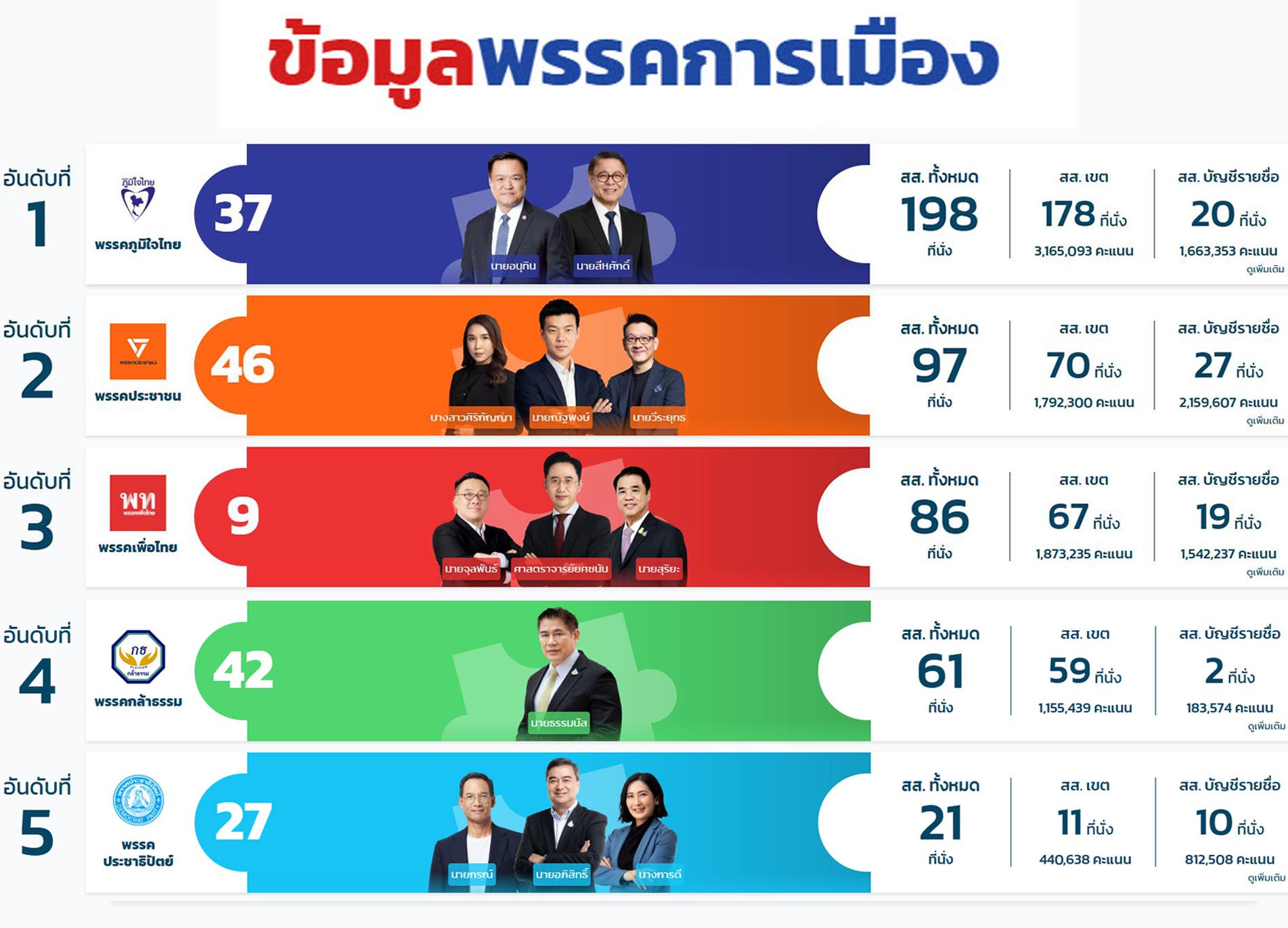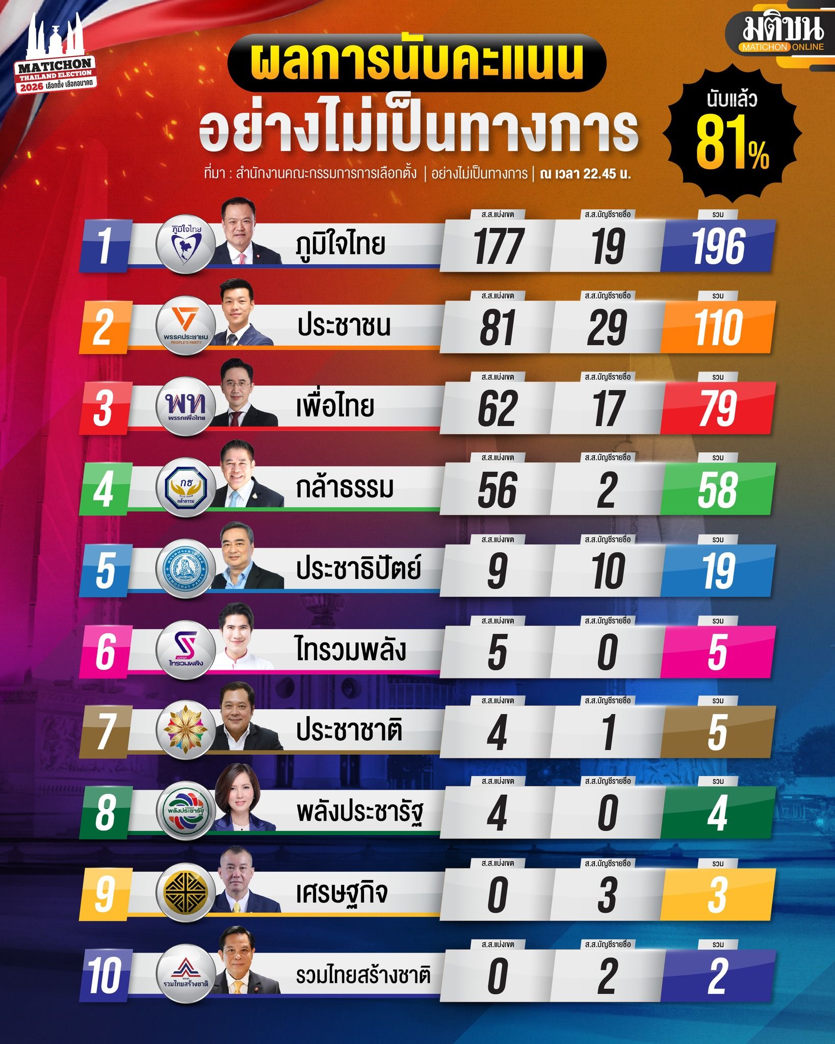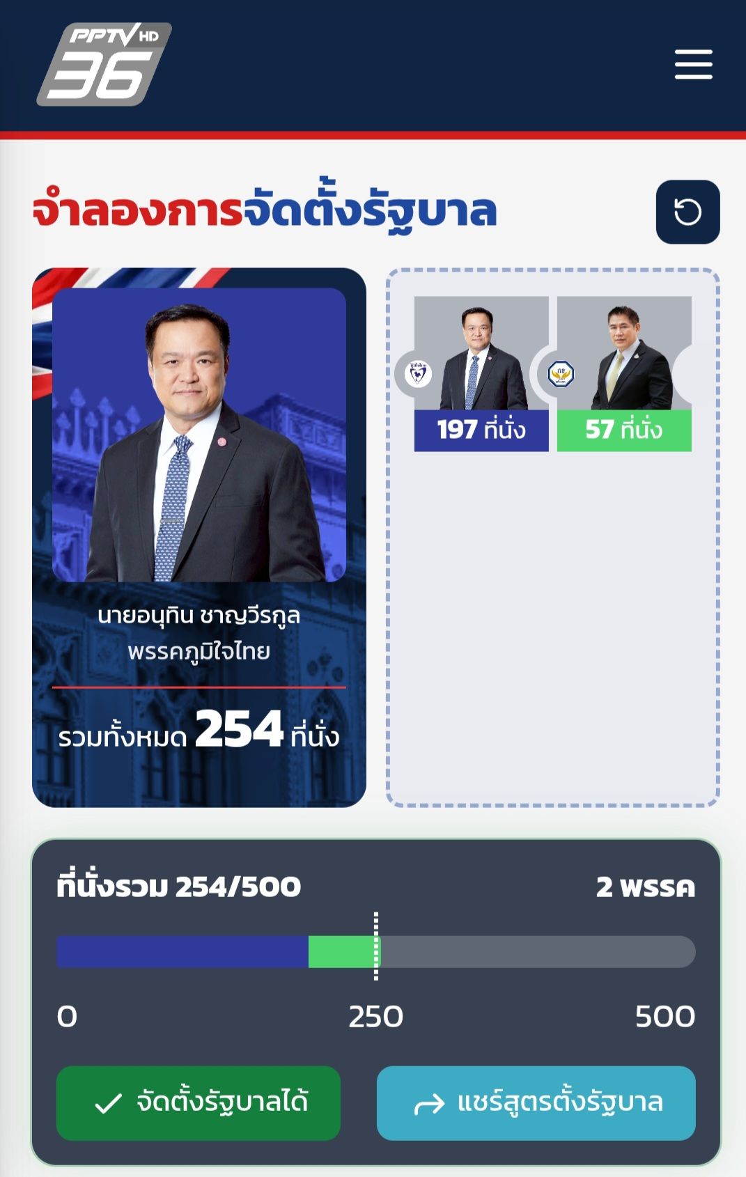 จำลองสูตรจัดตั้งรัฐบาลหลังนับคะแนนเลือกตั้ง 2569 (อย่างไม่เป็นทางการ) ณ วันที่ 8 ก.พ. 69 เวลา 23.48น.