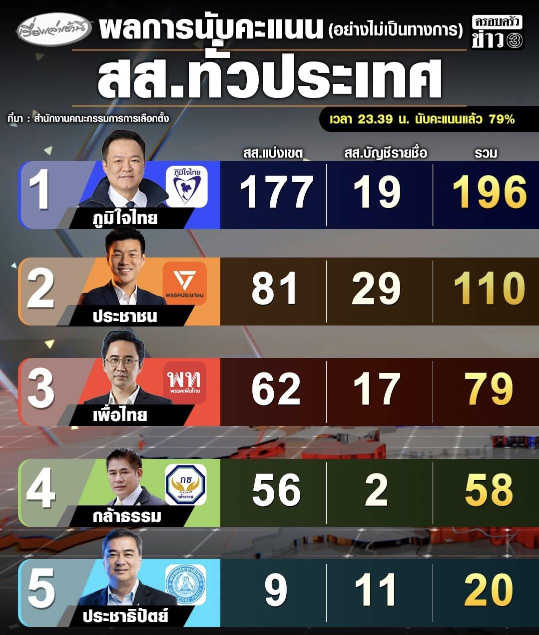 ขณะนี้แม้ว่ายังไม่มีการประกาศรับรองจำนวนสมาชิกที่พรรคภูมิใจไทยจะได้รับให้เข้ามาเป็น สส. จากการติดต่อประสานงานในพื้นที่ต่าง ๆ โดยตรงกับผู้สมัครทุกคน พอจะทราบได้ว่าพรรคภูมิใจไทยน่าจะมีจำนวน สส. จากการเลือกตั้งในวันนี้เป็นลำดับที่หนึ่ง