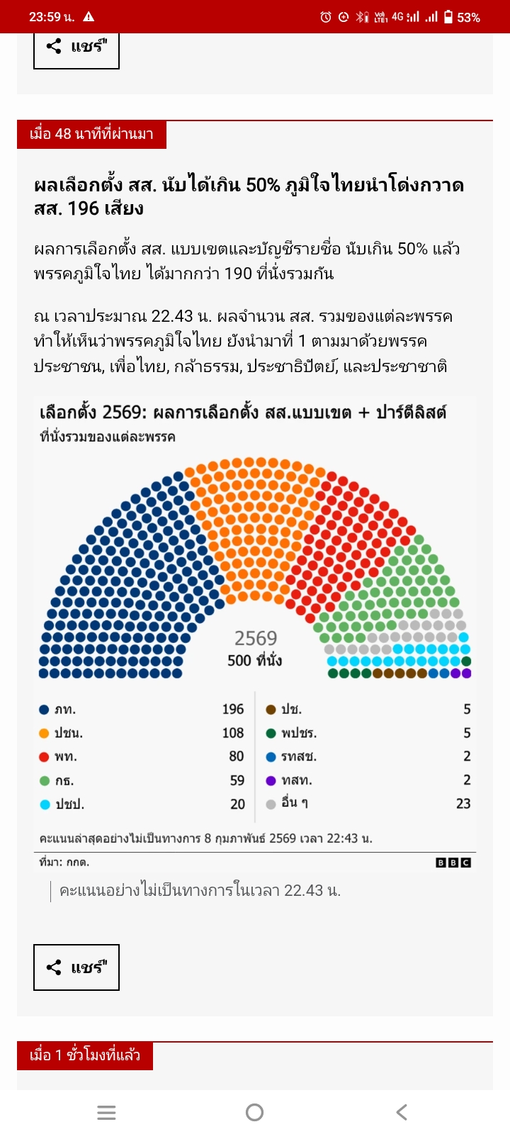 เพิ่งเช็กผลจากหน้าเว็บ Thai PBS สดๆ ร้อนๆ (นับไป 87.63% แล้ว) ตัวเลขน่าสนใจมากครับ จากภาพรวม: ภูมิใจไทย (สีน้ำเงิน): มาแรงมากในระบบเขต กวาดไปถึง 176 ที่นั่ง (รวมบัญชีรายชื่อนำโด่งอยู่ที่ 195 ที่นั่ง)