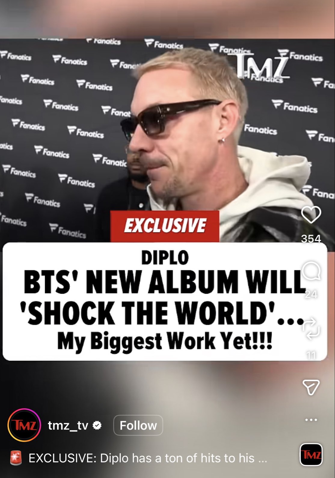 Diplo มีเพลงฮิตมากมาย แต่เขาคิดว่าโปรเจกต์ที่ยิ่งใหญ่ที่สุดในอาชีพของเขากำลังจะมาถึง เมื่ออัลบั้มคัมแบ็กของ BTS ที่ชื่อว่า "อารีรัง" ออกวางจำหน่าย