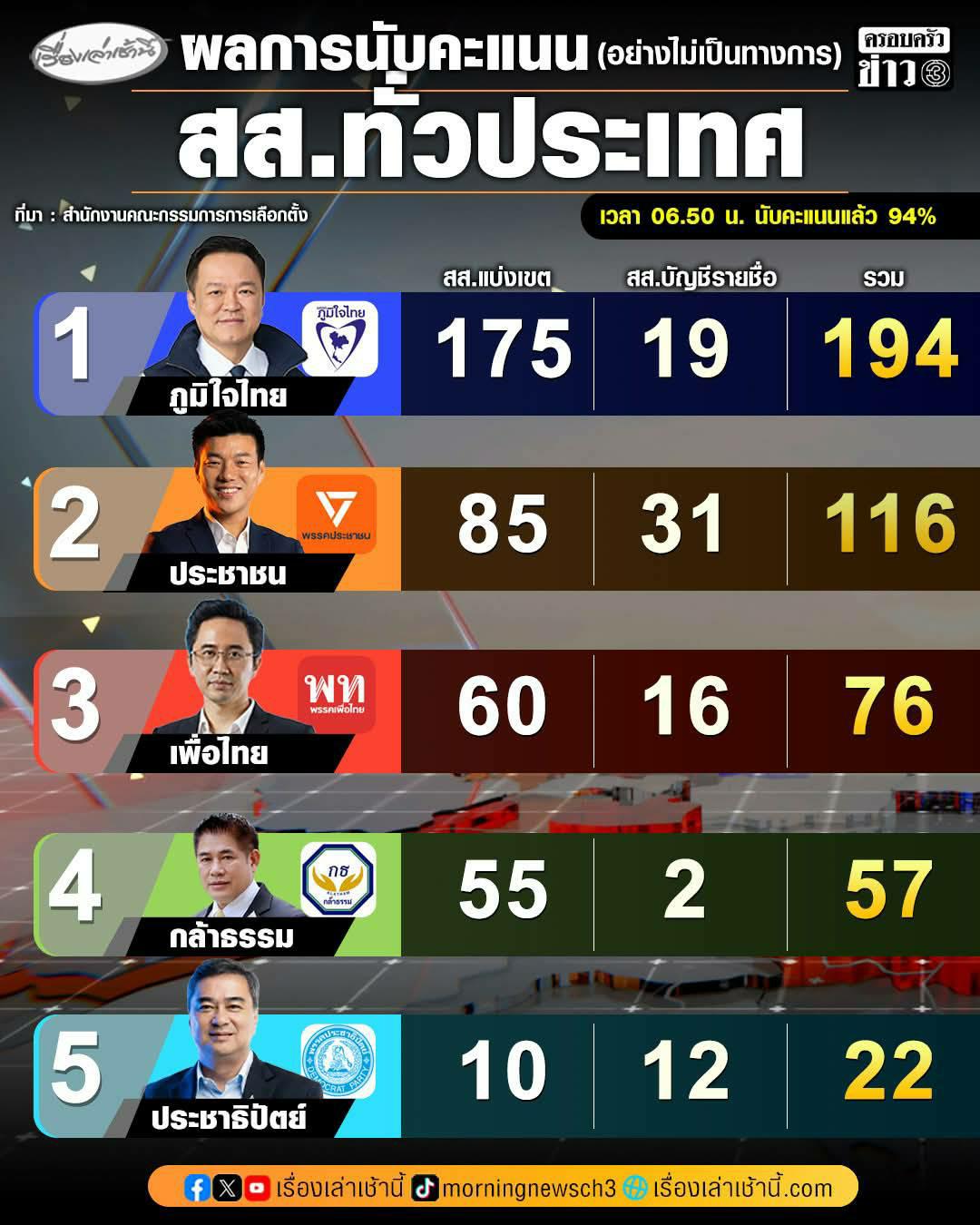 กกต. อัปเดตผลคะแนนการเลือกตั้ง 2569 อย่างไม่เป็นทางการ นับแล้ว 94% ณ เวลา 06.50 น.
