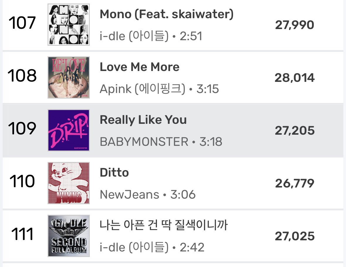 เพลง Really Like You ของ BABYMONSTER ขึ้นสู่อันดับ 14 บน Apple Music South Korea Chart หลังจากปล่อยเพลงมาแล้วกว่า 1 ปี ส่วนตัวอยาก เห็นเพลงนี้เข้า Top 10 ชาร์ตนี้ให้ได้ เพราะชอบเพลงน่ารักแนวนี้มากอีก