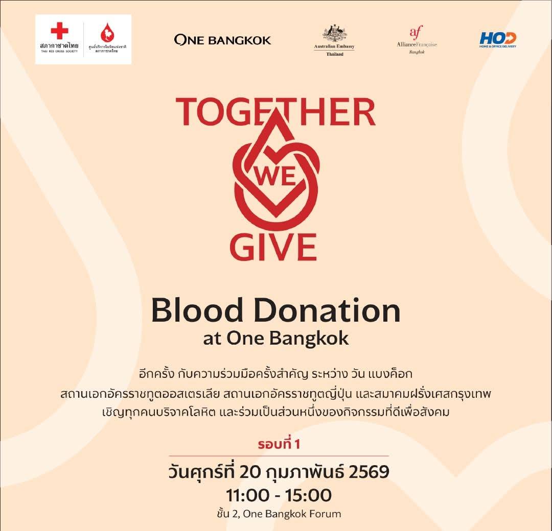 วัน แบงค็อก ขอเชิญชวนทุกคนมาร่วมเป็นส่วนหนึ่งในการสร้างสรรค์คุณค่าให้กับสังคม ผ่านกิจกรรมบริจาคโลหิต ร่วมกับศูนย์บริการโลหิตแห่งชาติ =AZbAPXSD8ZdIwGvU1RKd-ra8iK9Blg-on1X-M5HeQzcYKGr4fM8YfbzfoaSCWts04s5PQ28rVV4Oqkjndqfq9Pmg8KH-4Xj36AAomhJ0CedV9FPQzATymHY3tSiryunirgOuSqXzz3BIL1NzKgWMrM5CmzWhWXg9ltIVkKGoaGezzylfmJWeZnx2IBEhcGzRlt4&__tn__=-]K-R]สภากาชาดไทย Thai Red Cross Society ภายใต้กิจกรรม “Together we give – Blood Donation at One Bangkok” ในวันศุกร์ที่ 20 กุมภาพันธ์ 2569 ตั้งแต่เวลา 11.00 – 15.00 น. ที่บริเวณชั้น 2 วัน แบงค็อก ฟอรัม