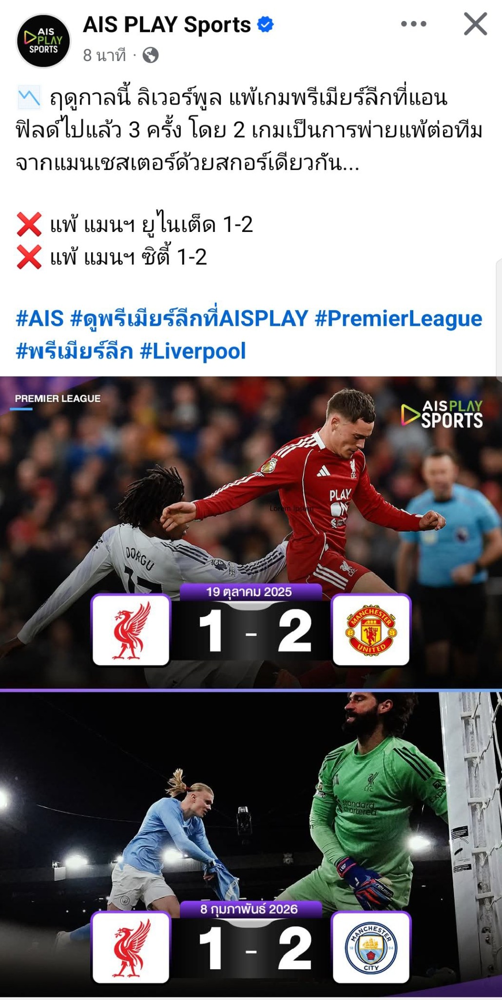 📉 2025/26 ลิเวอร์พูล แพ้เกมลีกที่แอนฟิลด์ไปแล้ว 3 โดย 2 เกมเป็นการพ่ายแพ้ต่อทีมจากแมนเชสเตอร์ด้วยสกอร์เดียวกัน ❌❌