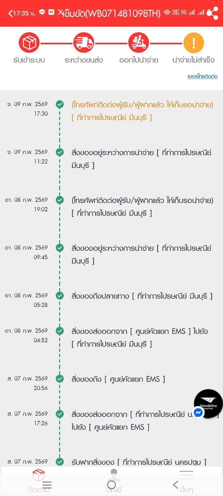 ขึ้นแบบนี้มา2วันแล้วครับขนาดส่งemsแล้วไม่มีเจ้าหน้าที่โทรมาเลยด้วยครับคือไม่รู้ว่าของหายหรืออะไรทำอย่างไรได้บ้างครีบนอกจากรอ😢ติดต่อทางโทรศัพท์ไปก็ให้เบอร์คนส่งมาแต่คนส่งไม่รับ
