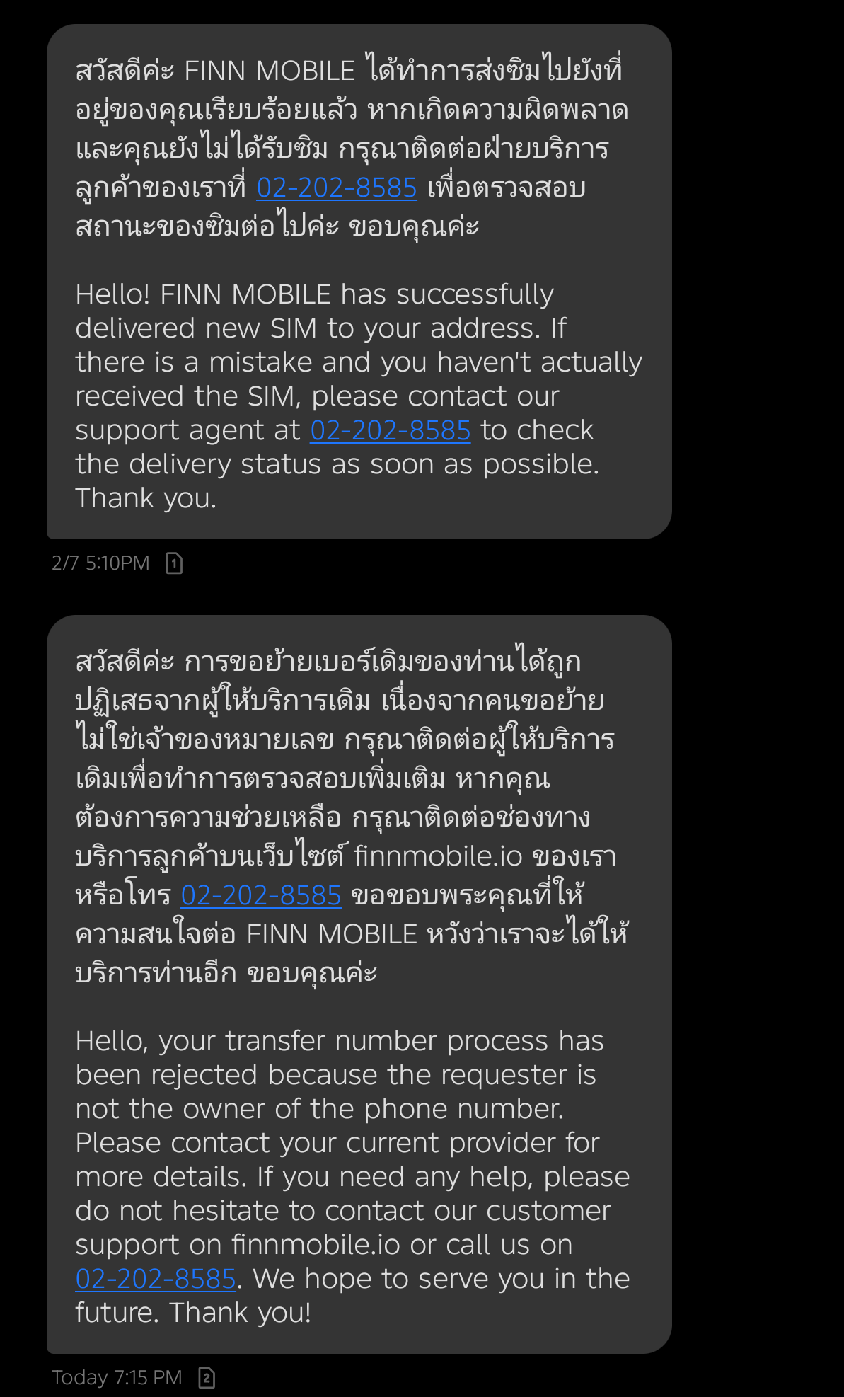 ผมย้ายค่ายซิมเน็ตจากค่ายเขียว ไปFinn moblie แต่มีข้อความส่งมาปฏิเสธ