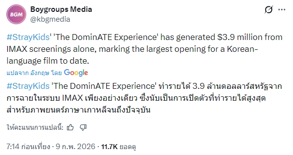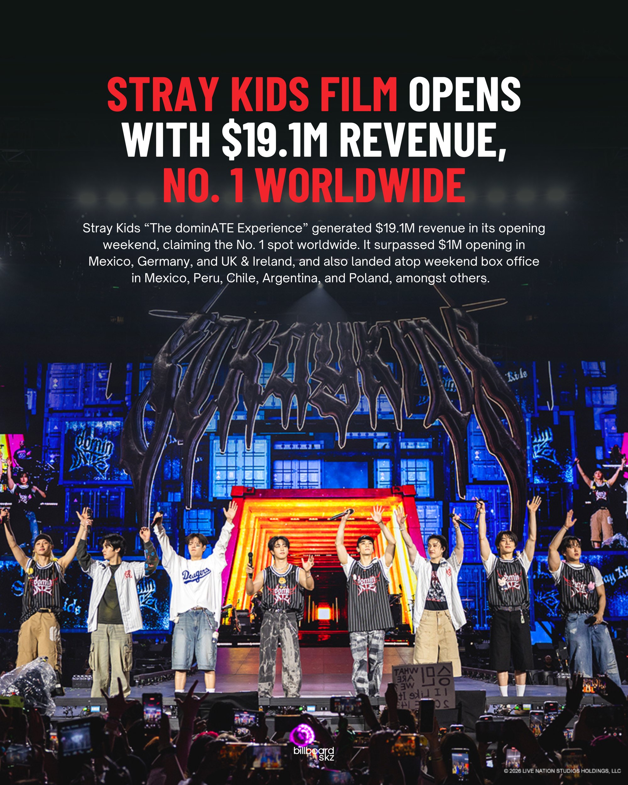 🔥 Stray Kids “The dominATE Experience” เป็นภาพยนตร์ที่ทำรายได้สูงสุดอันดับ 1 ของโลก ทำรายได้ 19.1 ล้านดอลลาร์สหรัฐในช่วงสุดสัปดาห์แรกที่เข้าฉายใน 61 ภูมิภาค และทำรายได้เปิดตัวสูงสุดสำหรับภาพยนตร์สารคดีคอนเสิร์ต K-Pop