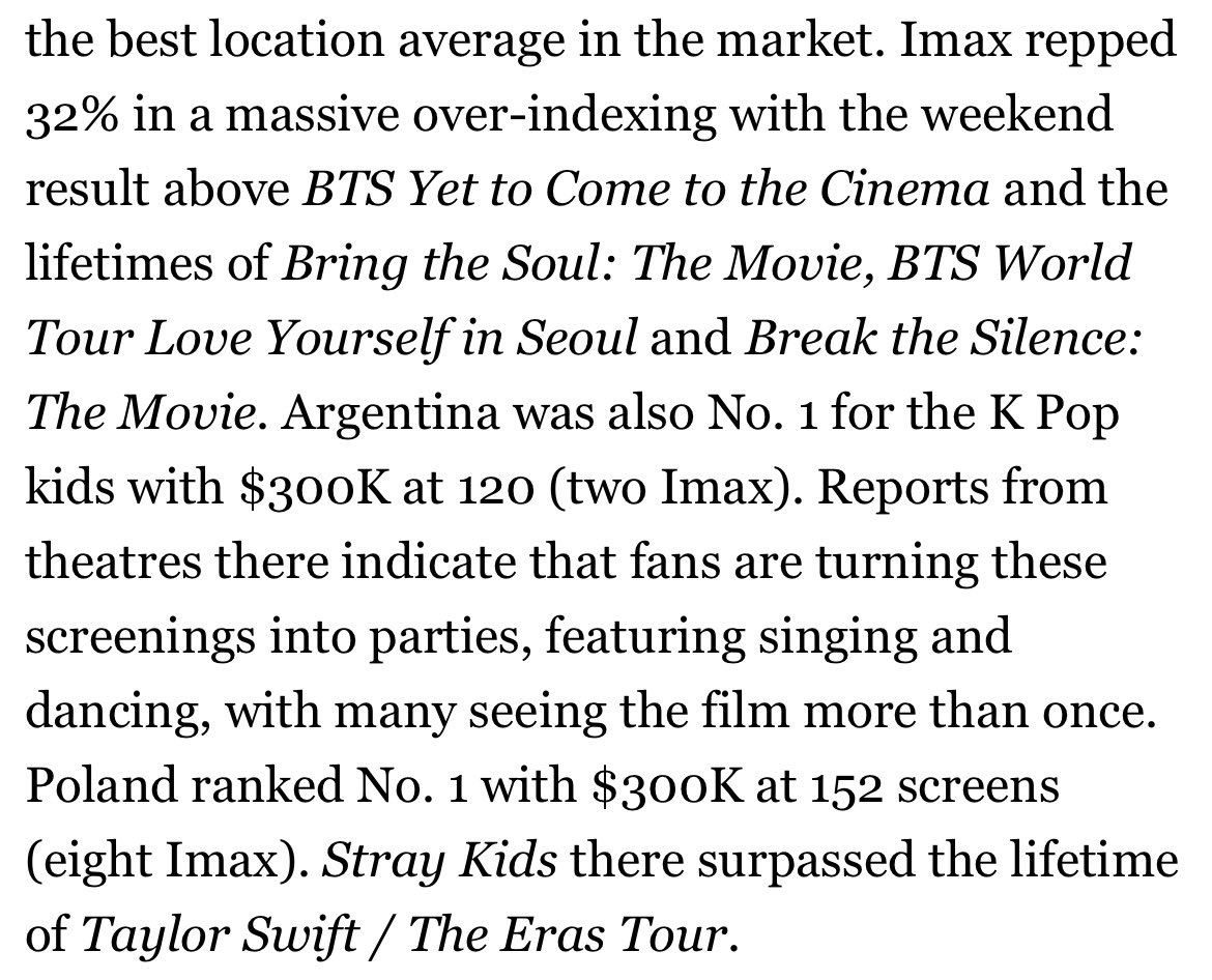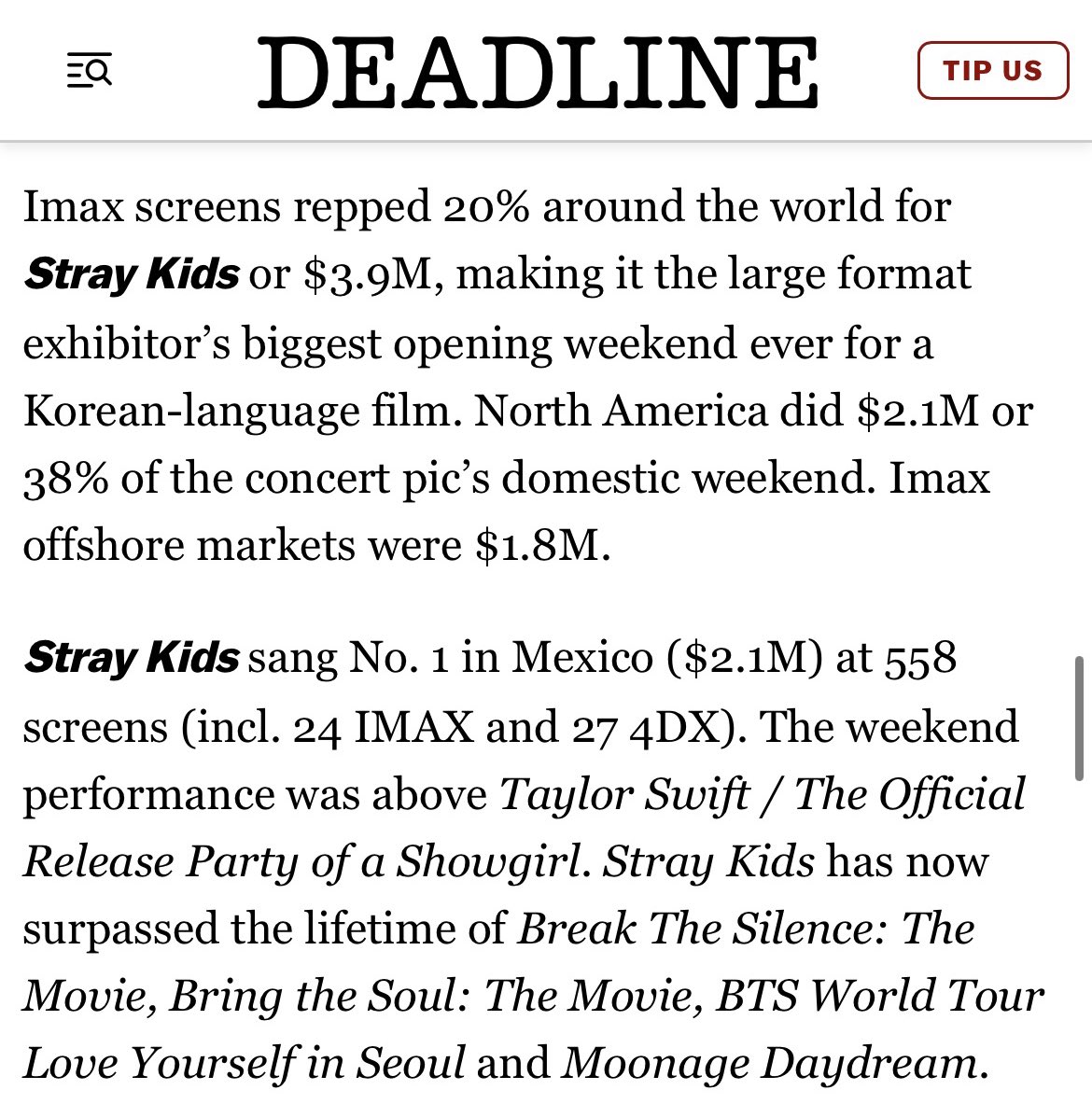 Stray Kids ทำลายสถิติรายได้เปิดตัวสูงสุดในประวัติศาสตร์ของภาพยนตร์ภาษาเกาหลี โดยภาพยนตร์เรื่อง “The DominATE Experience” ทำรายได้ 3.9 ล้านดอลลาร์สหรัฐ จากการฉายในระบบ IMAX เพียงอย่างเดียว