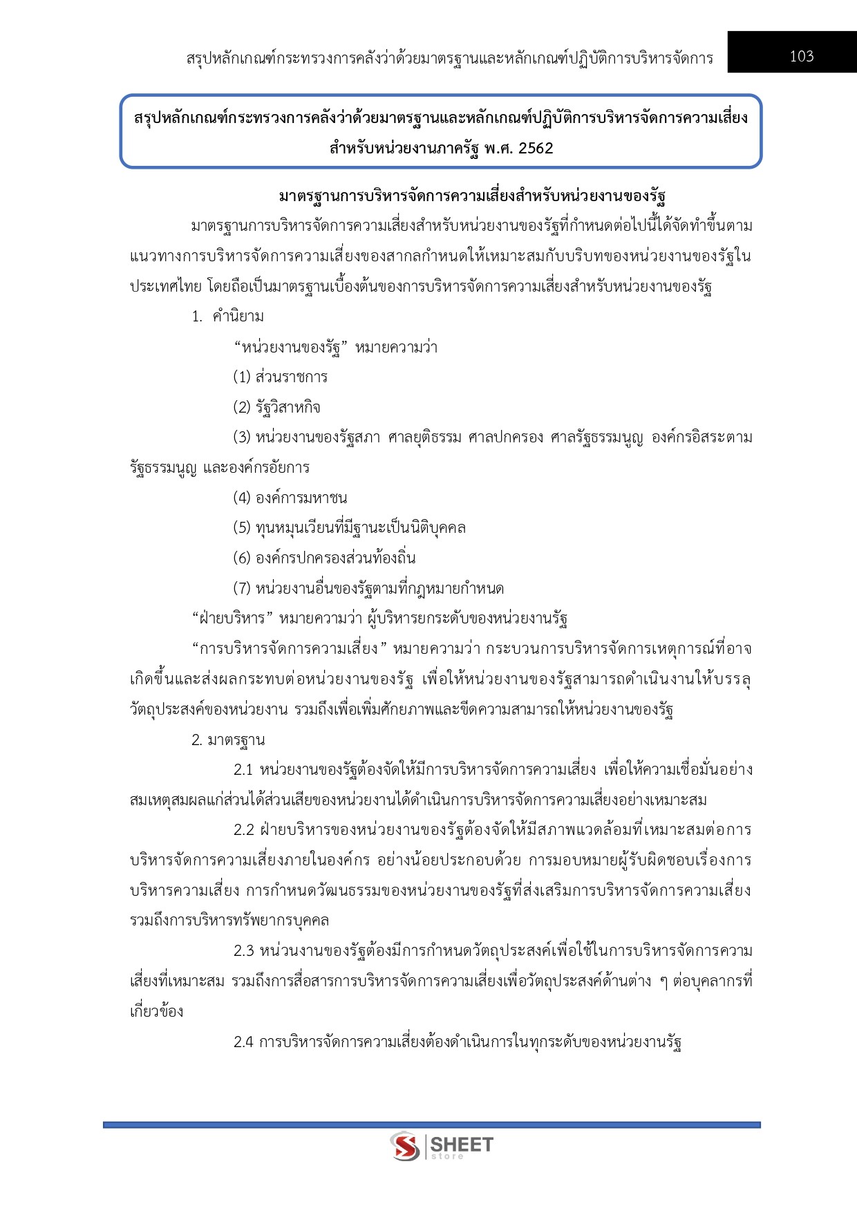 - สรุปหลักเกณฑ์กระทรวงการคลังว่าด้วยมาตรฐานและหลักเกณฑ์ปฏิบัติการบริหารจัดการความเสี่ยง สำหรับหน่วยงานภาครัฐ พ.ศ. 2562