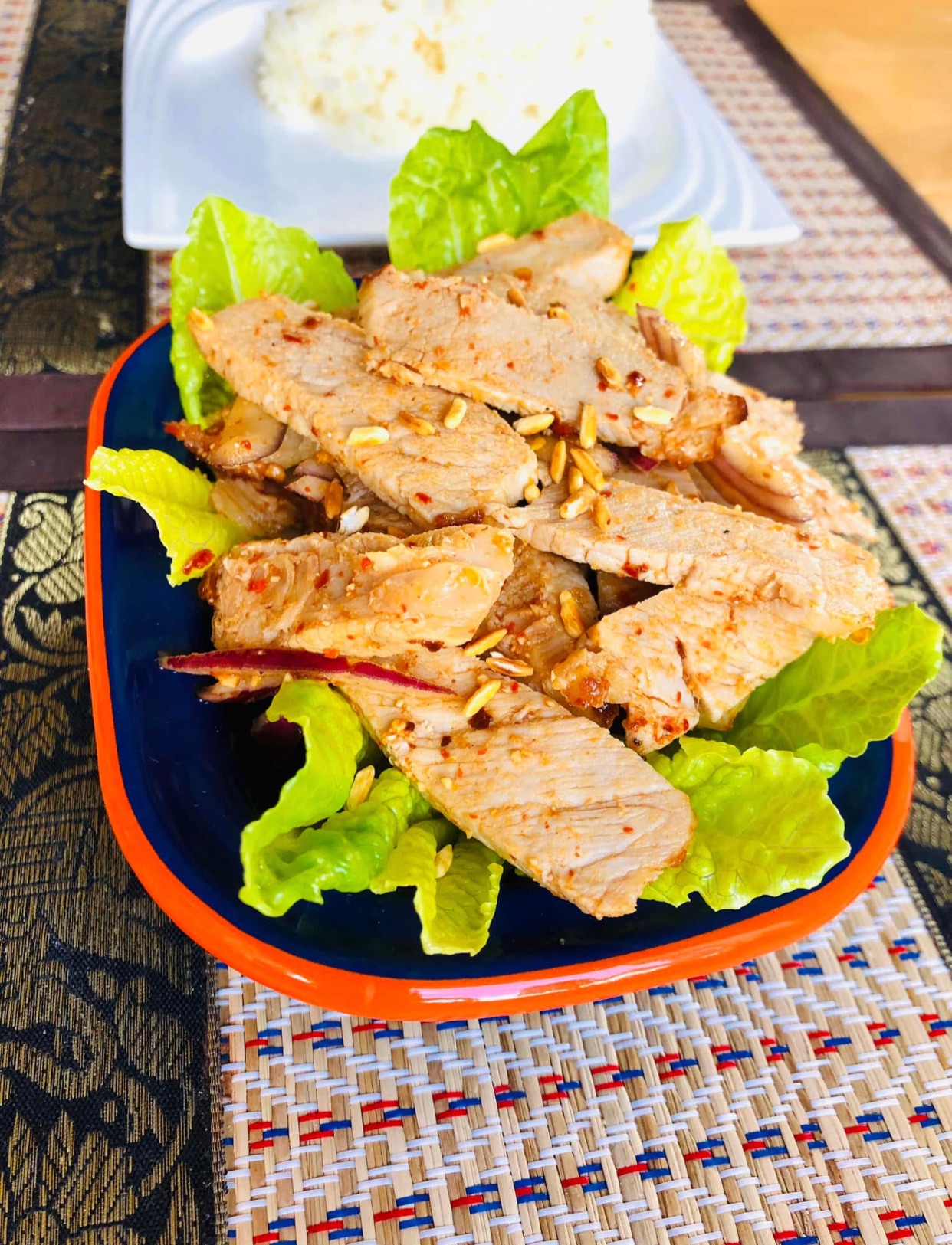 ไก่ผัดเม็ดมะม่วงฯ & หมูย่างปรุงด้วยเครื่องลาบ