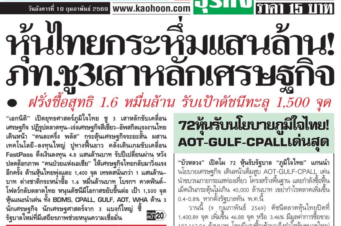 นายกรภัทร วรเชษฐ์ ผู้ช่วยกรรมการผู้จัดการใหญ่ หัวหน้าสายงานวิจัย บริษัทหลักทรัพย์(บล.) กรุงศรี จำกัด (มหาชน) หรือ KSS คาดว่า ดัชนีตลาดหุ้นไทย วันนี้ (9 ก.พ. 69) ปรับขึ้นในกรอบแนวต้าน 1,395-1,415 จุด แนวรับ 1,350-1,341 จุด รับเสถียรภาพรัฐบาลใหม่เป็นแรงส่งสำคัญต่อการปรับมุมมองของตลาดหุ้นไทย