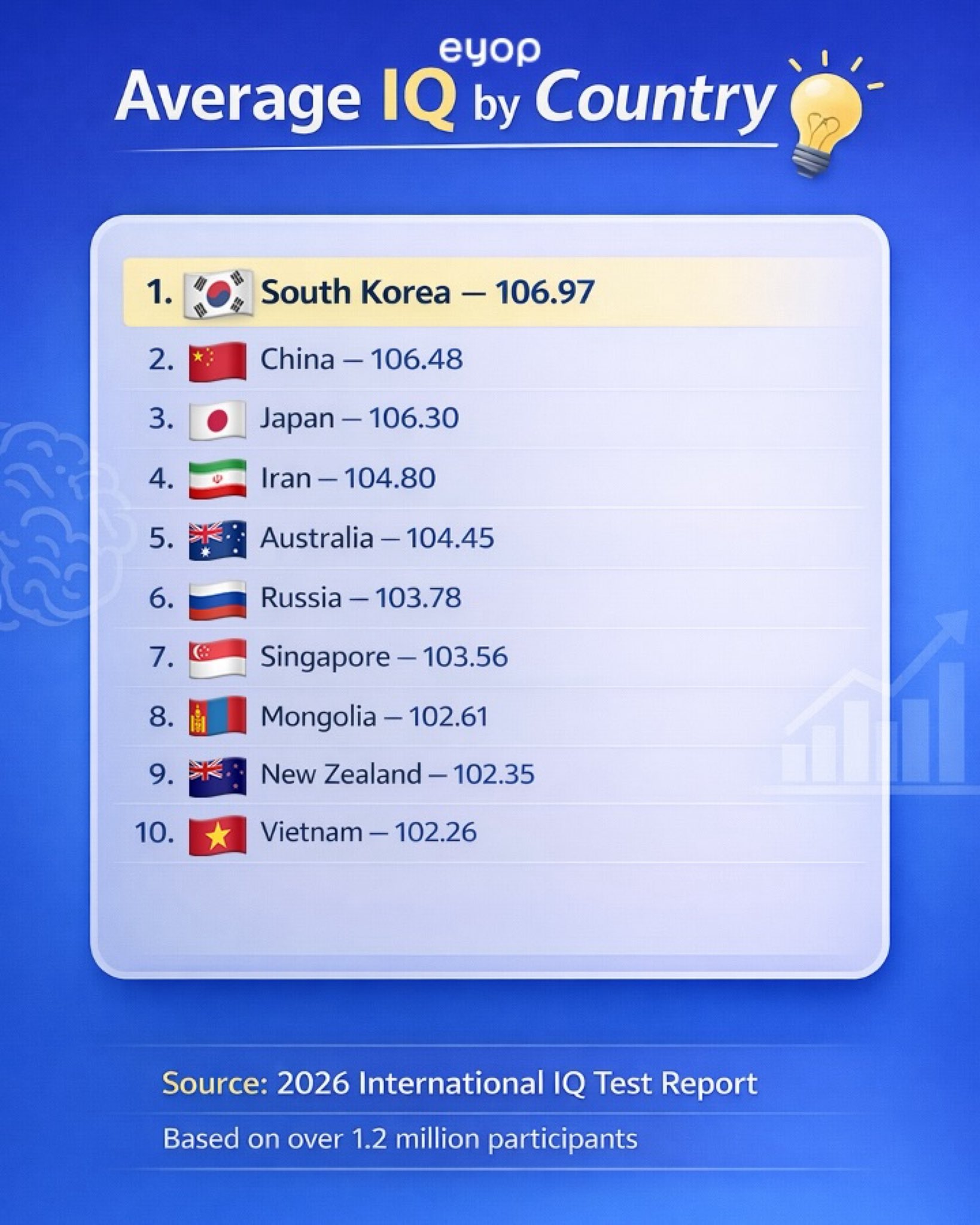 เกาหลีบันทึก IQ เฉลี่ยสูงสุดที่ 106.97 ตามมาด้วยจีนและญี่ปุ่น นับเป็นผลลัพธ์ที่น่าภูมิใจมากสำหรับชาวเกาหลี