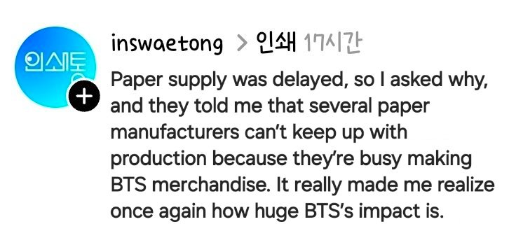 "การจัดส่งกระดาษล่าช้ามาก ผมก็เลยถามว่าทำไม และพวกเขาก็บอกผมว่า ผู้ผลิตกระดาษหลายรายผลิตไม่ทัน เพราะมัวแต่ยุ่งกับการทำสินค้า (Merchandise) ของ BTS อยู่ มันทำให้ผมตระหนักขึ้นมาอีกครั้งเลยว่า อิทธิพลของ BTS นั้นมหาศาลขนาดไหน"