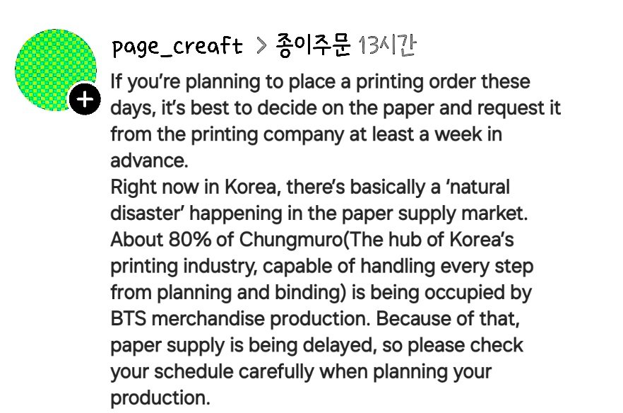 "ถ้าคุณมีแผนจะสั่งงานโรงพิมพ์เร็วๆ นี้ ผมขอแนะนำอย่างยิ่งให้รีบเลือกกระดาษและแจ้งความจำนงล่วงหน้าอย่างน้อยหนึ่งสัปดาห์ ตอนนี้วงการกระดาษกำลังเจอกับสภาวะที่แทบจะเป็น 'ภัยพิบัติทางธรรมชาติ' เลยทีเดียว เพราะโรงพิมพ์กว่า 80% ในย่านชุงมูโร (Chungmuro) ถูกจองเต็มพื้นที่เพื่อผลิตสินค้า Official ของ BTS ส่งผลให้การจัดซื้อจัดหาเนื้อกระดาษล่าช้าอย่างมาก ดังนั้น โปรดตรวจสอบตารางเวลาของคุณให้ดีก่อนเริ่มขั้นตอนการผลิตนะครับ"