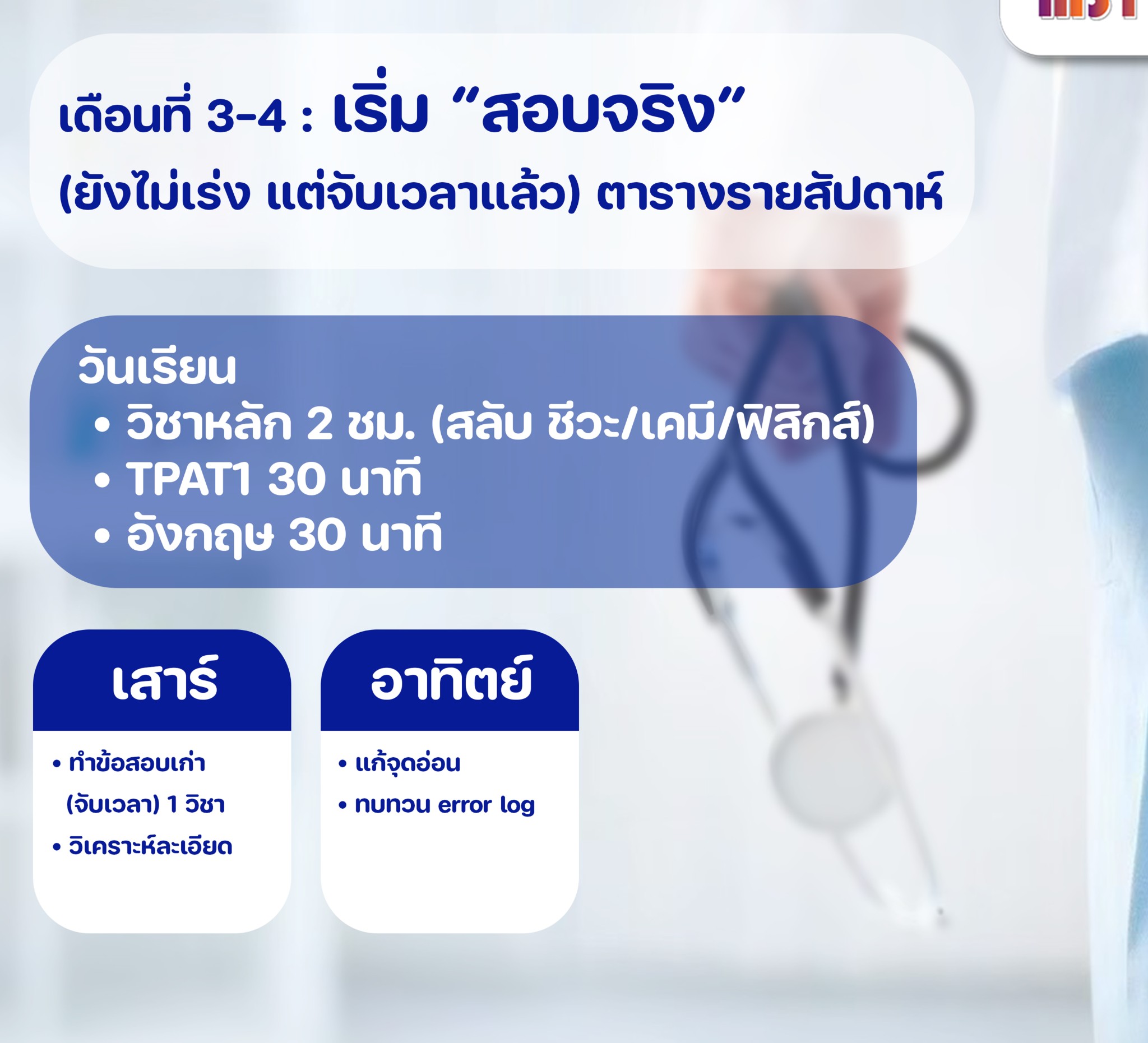 2. เดือน 3-4 เติมฟิสิกส์ + คณิต และเริ่มลุย "ข้อสอบจริง" แบบจับเวลา