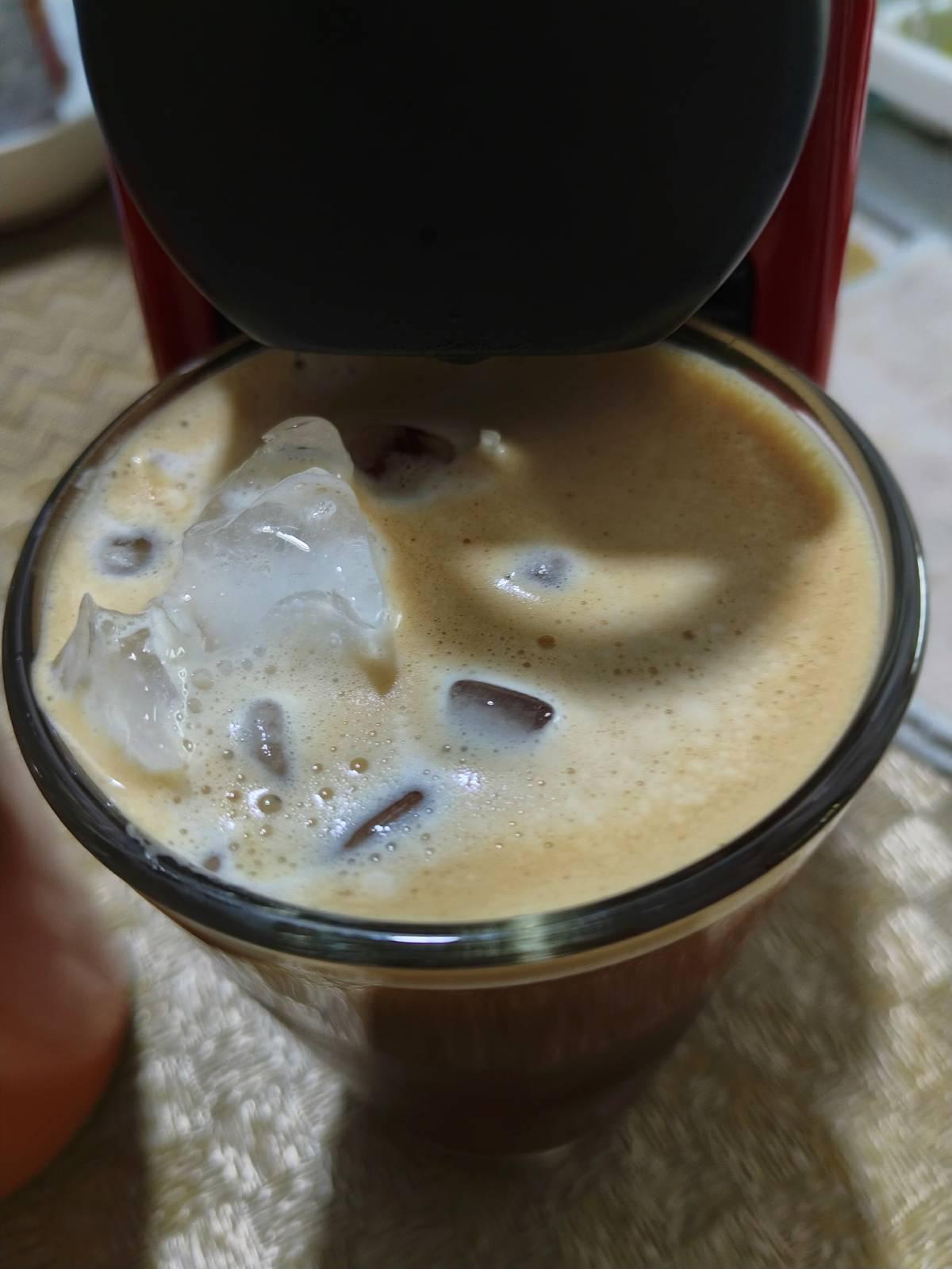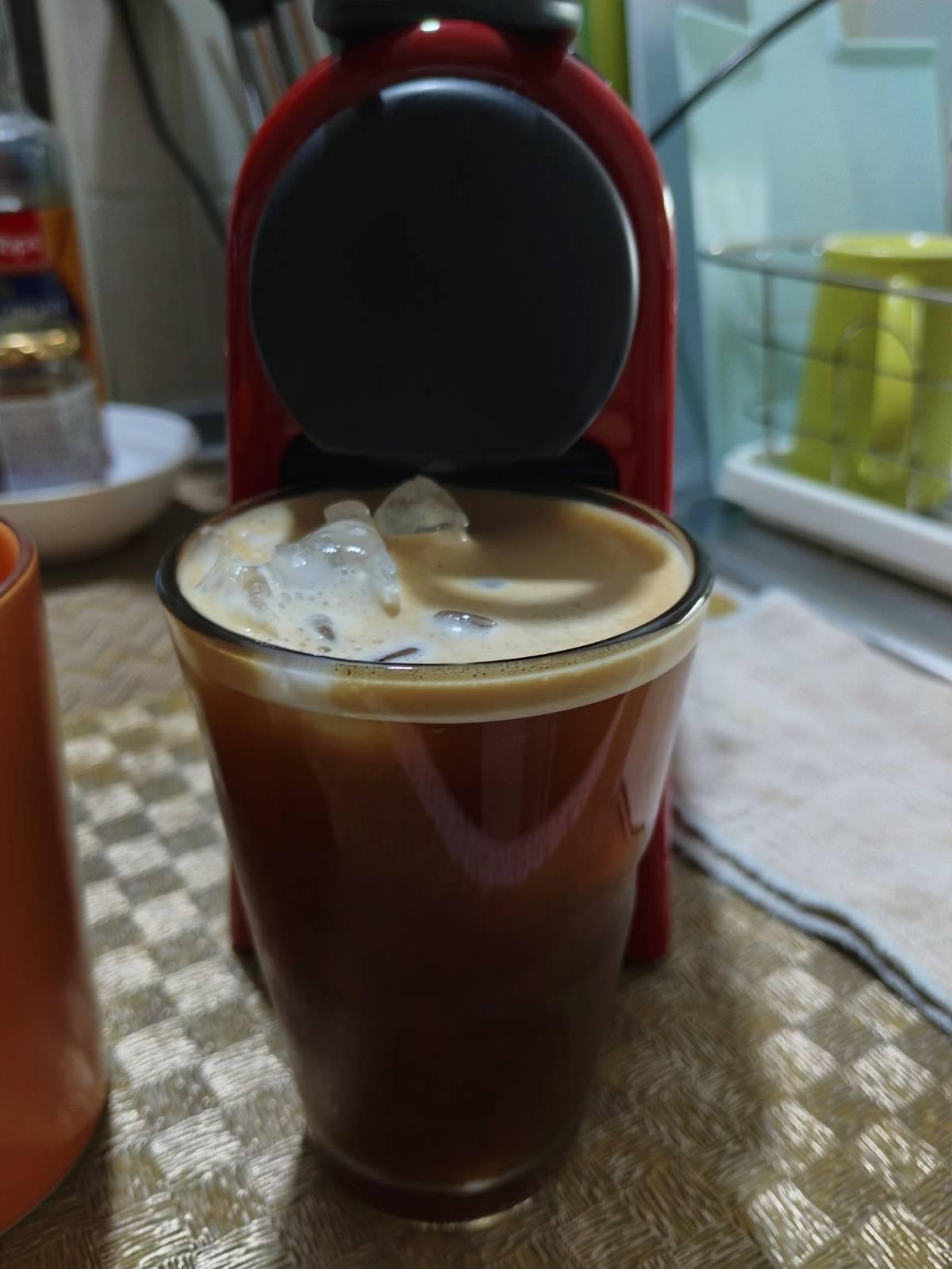 ตามด้วยกาแฟเย็น ลองก์แบล็คครับ เหมือนอเมริกาโน่ แต่เอาเอสเปรสโซ่ร้อนๆ ราดลงบนน้ำแข็ง น้ำเย็นจัดๆ