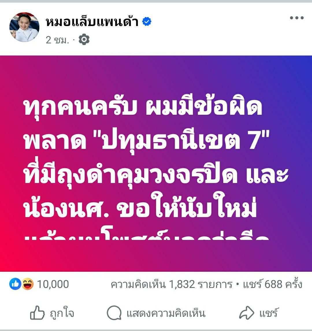หมอแล็บแพนด้า อินฟลูเอนเซอร์ ชื่อดัง โพสเฟสบุ๊ค กล่าวขอโทษหน่วยเลือกตั้ง เขต 7 จังหวัดปทุมธานี ที่ ม.ราชมงคล คลองหก