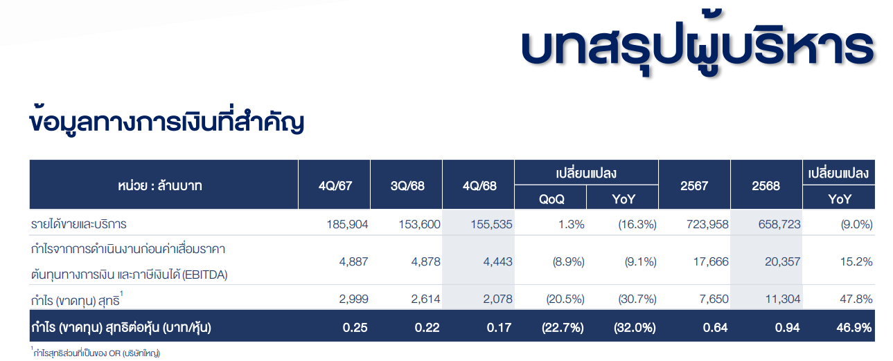 ผลการดำเนินงาน 4Q/68 บริษัท ปตท. น้ำมันและการค้าปลีก จำกัด (มหาชน) และบริษัทย่อย (“OR”) มีรายได้ขายและบริการ155,535 ล้านบาท เพิ่มขึ้น 1,935 ล้านบาท (+1.3%) เมื่อเทียบกับ 3Q/68 ตามปัจจัยฤดูกาล โดยกลุ่มธุรกิจ Mobility เพิ่มขึ้น 2.1% จากปริมาณจำหน่ายที่ปรับตัวดีขึ้น โดยเฉพาะน้ำมันอากาศยานและดีเซล และกลุ่มธุรกิจ Lifestyleเพิ่มขึ้นเช่นเดียวกันที่ 3.9% จากทั้งธุรกิจค้าปลีกอาหารและเครื่องดื่ม และธุรกิจค้าปลีกอื่น ๆ ในขณะที่กลุ่มธุรกิจ Global ลดลง 20.1% จากปริมาณจำหน่ายที่ลดลง โดยหลักจากประเทศฟิลิปปินส์ ใน 4Q/68 มี EBITDA จำนวน 4,443 ล้านบาท ลดลง 435 ล้านบาท (-8.9%)จากไตรมาสก่อนหน้า โดยหลักจากกลุ่มธุรกิจ Global ที่ภาพรวมกำไรขั้นต้นเฉลี่ยต่อลิตรปรับตัวลดลง และกลุ่มธุรกิจ Lifestyle ที่ค่าใช้จ่ายดำเนินงานที่ปรับเพิ่มขึ้น ในขณะที่กลุ่มธุรกิจ Mobility ปรับเพิ่มขึ้นเล็กน้อย ตามปริมาณจำหน่ายที่เพิ่มขึ้น แม้ว่ากำไรขั้นต้นเฉลี่ยต่อลิตรจะทรงตัว สำหรับภาพรวมค่าใช้จ่ายดำเนินงานเพิ่มขึ้น โดยหลักจากค่าใช้จ่ายด้านบุคลากร และค่าโฆษณาประชาสัมพันธ์และส่งเสริมการขาย สำหรับส่วนแบ่งกำไรจากเงินลงทุน (Share of gain from investments) ภาพรวมลดลงเล็กน้อย ในไตรมาสนี้อัตราแลกเปลี่ยน สกุลเงินบาทเทียบดอลลาร์สหรัฐฯแข็งค่าขึ้น ส่งผลให้เกิดผลขาดทุนจากอัตราแลกเปลี่ยน และมีผลกำไรจากตราสารอนุพันธ์รวมทั้งมีการตั้ง สำรองด้อยค่าเงินลงทุนในบริษัทร่วมจำนวน 343 ล้านบาท ทำให้ใน 4Q/68 OR มีกำไรสุทธิจำนวน 2,078 ล้านบาท ลดลงจากไตรมาสก่อน 536 ล้านบาท (-20.5%) และคิดเป็นกำไรต่อหุ้น 0.17 บาท