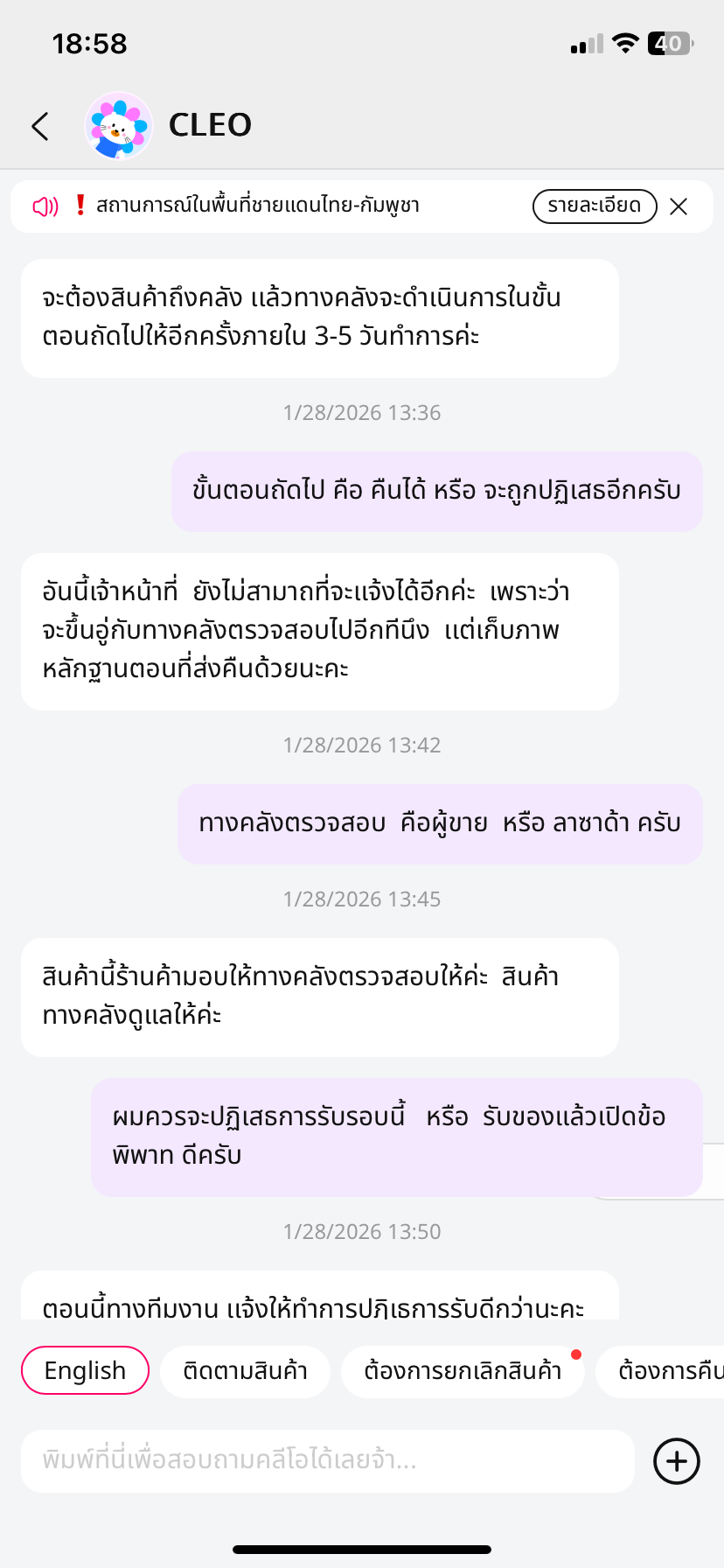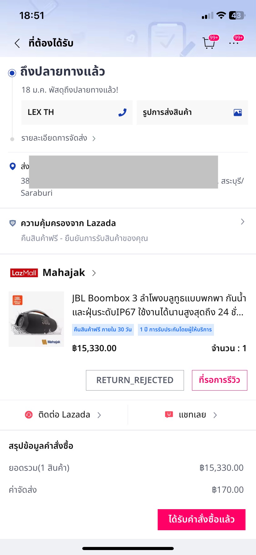 เมื่อวันที่16/1/69 ผมได้ซื้อสินค้าผ่านแอพลาซาด้า สินค้าคือลำโพงบลูทูธ JBL boombox3 ราคา 11875 จากร้าน mahajak เป็นผู้ขายในแอพของลาซาด้า ของมาถึงผมเมื่อวันที่ 18/1/69 ผมรู้สึกไม่อยากได้ของแล้ว (ยังไม่ได้เปิดกล่อง) จึงทำเรื่องส่งคืน (ร้านค้าระบุสามารถคืนสินค้าได้ใน30วัน ทุกกรณี) วันที่ 22/1/69 ของถูกส่งคืน ไปถึงคลังลาซาด้าเมื่อวันที่ 26/1/69 ทางคลังลาซาด้าปฏิเสธการรับคืน อ้างว่าสินค้าถูกใช้งานแล้ว และได้ส่งกลับพัสดุมาถึงผม ระหว่างส่งมานั้น ผมได้ติดต่อทางเจ้าหน้าที่ลาซาด้าเล่าเหตุผลให้ฟังเขาได้แนะนำบอกให้ตีกลับพัสดุกลับคลัง ไม่ต้องรับ ผมได้ทำตามคำแนะนำนั้น ของถูกตีกลับไปถึงคลังในวันที่ 2/2/69 จนถึงวันนี้ผมยังไม่ได้รับความคืบหน้าการคืนเงิน ทั้งของก็ไม่มีรายงานเข้ามาเลยว่าจะดำเนินการอย่างไรต่อ หายทั้งของ เงินก็ไม่ได้คืน โทรถาม แชทแถม ก็ได้คำตอบว่าให้รอตรวจสอบ 3-5วัน รอจนตอนนี้ก็ยังให้รออยู่ รบกวนชวยตามเรื่องให้ผมด้วยครับ มูลค่าสิ่งของ 11,875 บาท (มีหลักฐานการคุย การส่งของ ทั้งหมด)