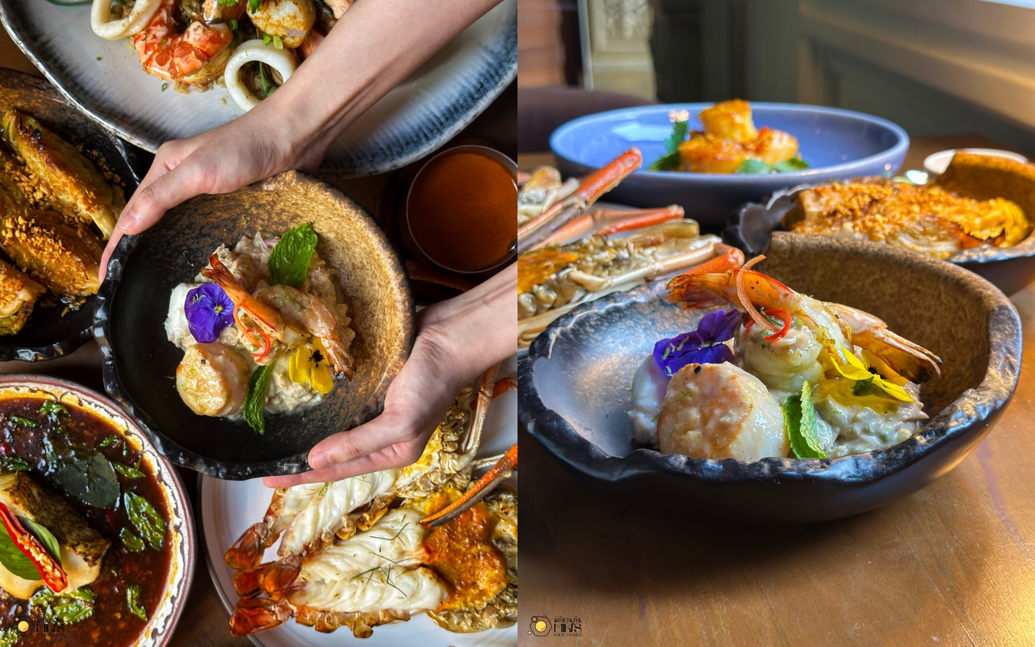 Yum Talay Tom Ka Haeng (580) ยำทะเลรวมมิตรที่นำรสชาติของ ต้มข่า มาทำแบบแห้ง ตัวซอสกะทิมีความหอมมันและเข้มข้น หอมสมุนไพรแบบถึงเครื่อง