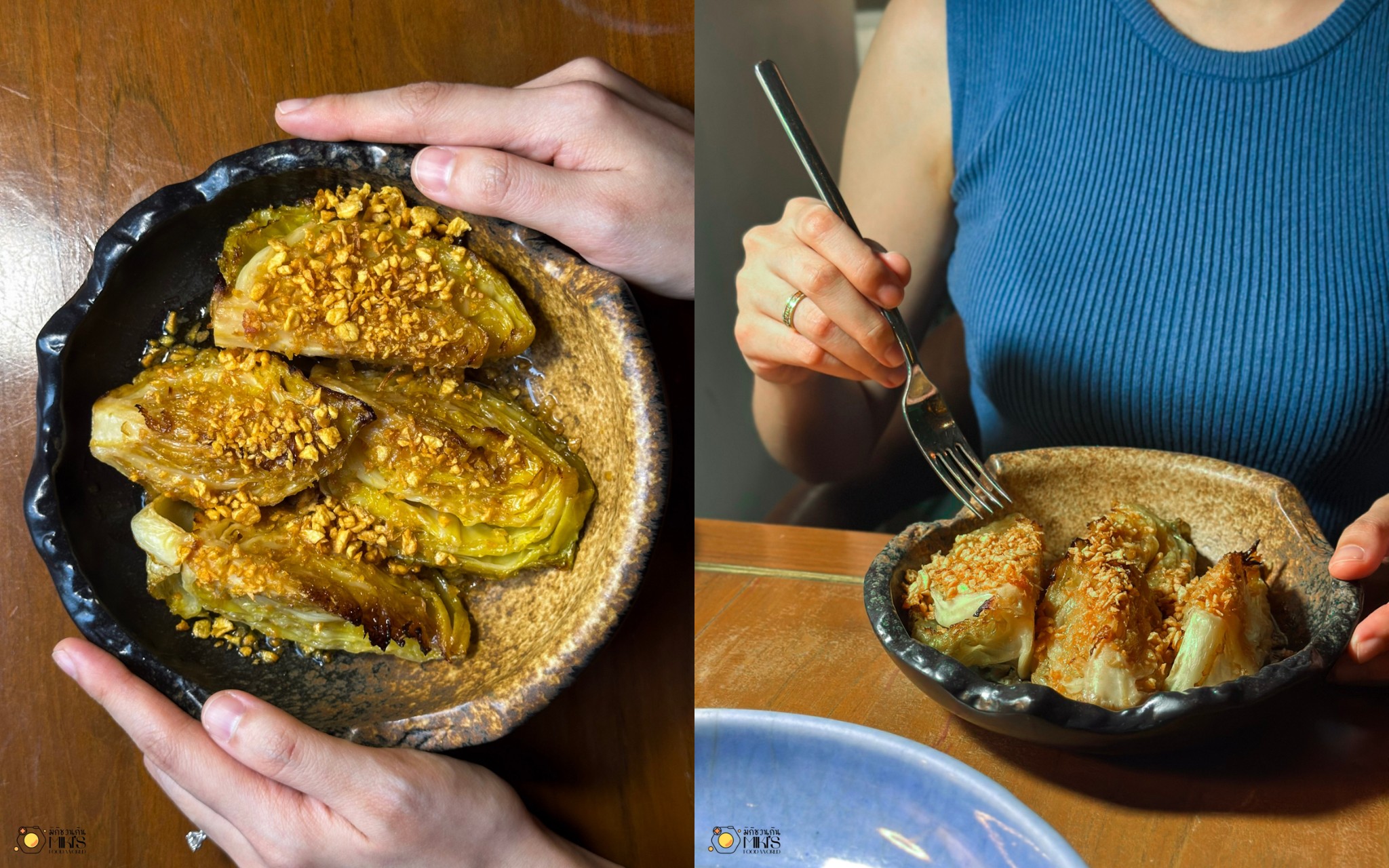 Ka Lam Plee Ob Nam Pla (120) กะหล่ำปลีอบน้ำปลา หอมกลิ่นน้ำปลาแท้ๆ ผักมีความนุ่มและหวานฉ่ำมาก ท็อปด้วยกระเทียมเจียวหอมๆ เป็นเมนูเคียงที่ดูเรียบง่ายแต่รสชาติไม่ธรรมดาเลย ใครได้ลองก็ติดใจทั้งนั้น