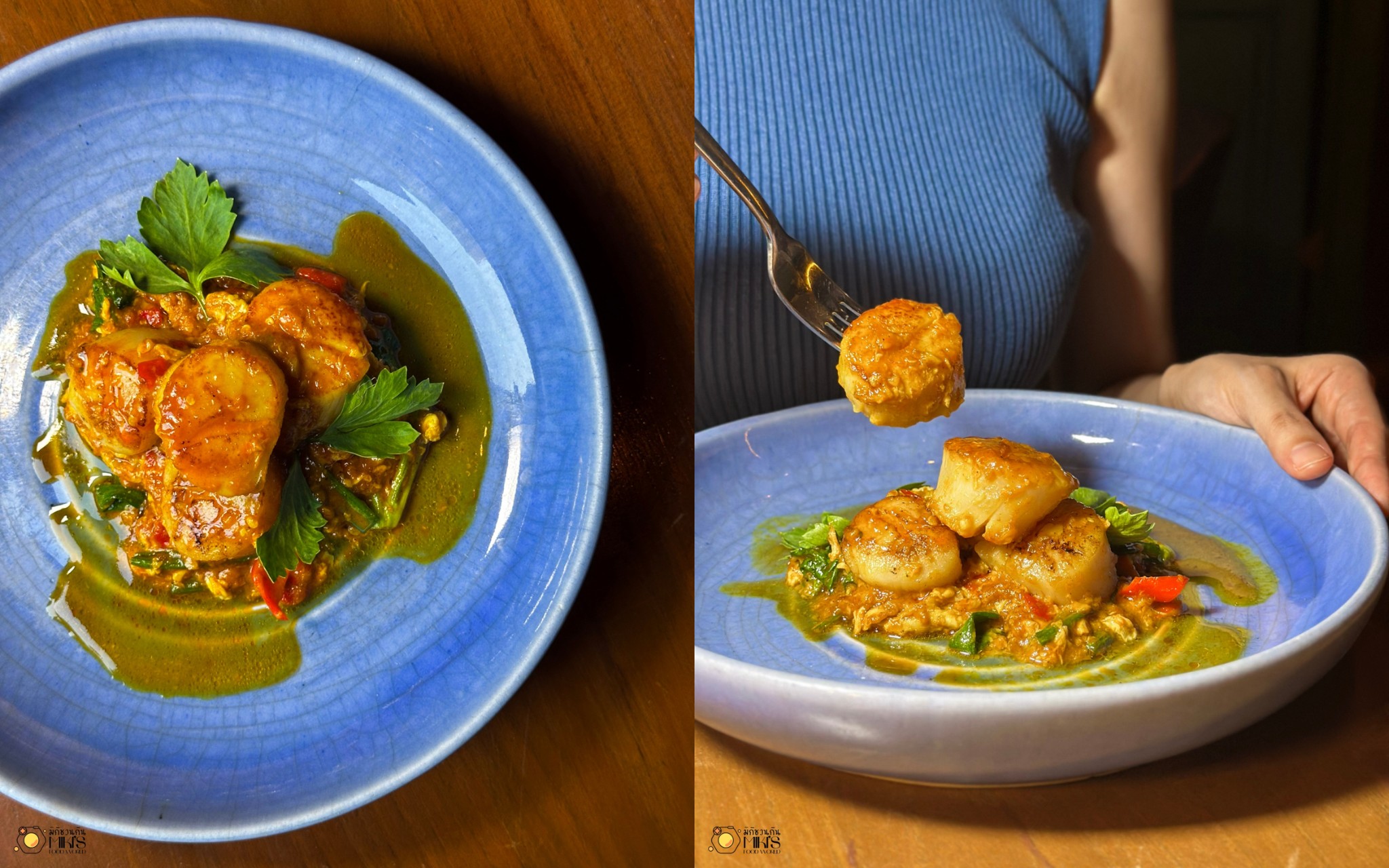 Hoy Shell Pad Phong Kari (850) เชฟเลือกใช้ Hokkaido Scallops ตัวโตๆ ผัดกับผงกะหรี่จนหอมนวล ได้ความหวานจากหอยเชลล์และความมันจากซอสผงกะหรี่สีเหลืองทอง