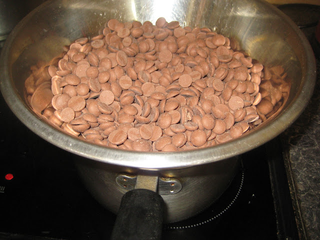 ตุ่นช็อกโกแลตอีกครั้งใช้สำหรับชุบเค้ก จากนั้นนำก้อนเค้กมาชุบให้ทั่ว