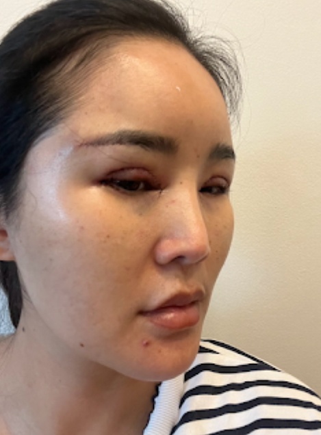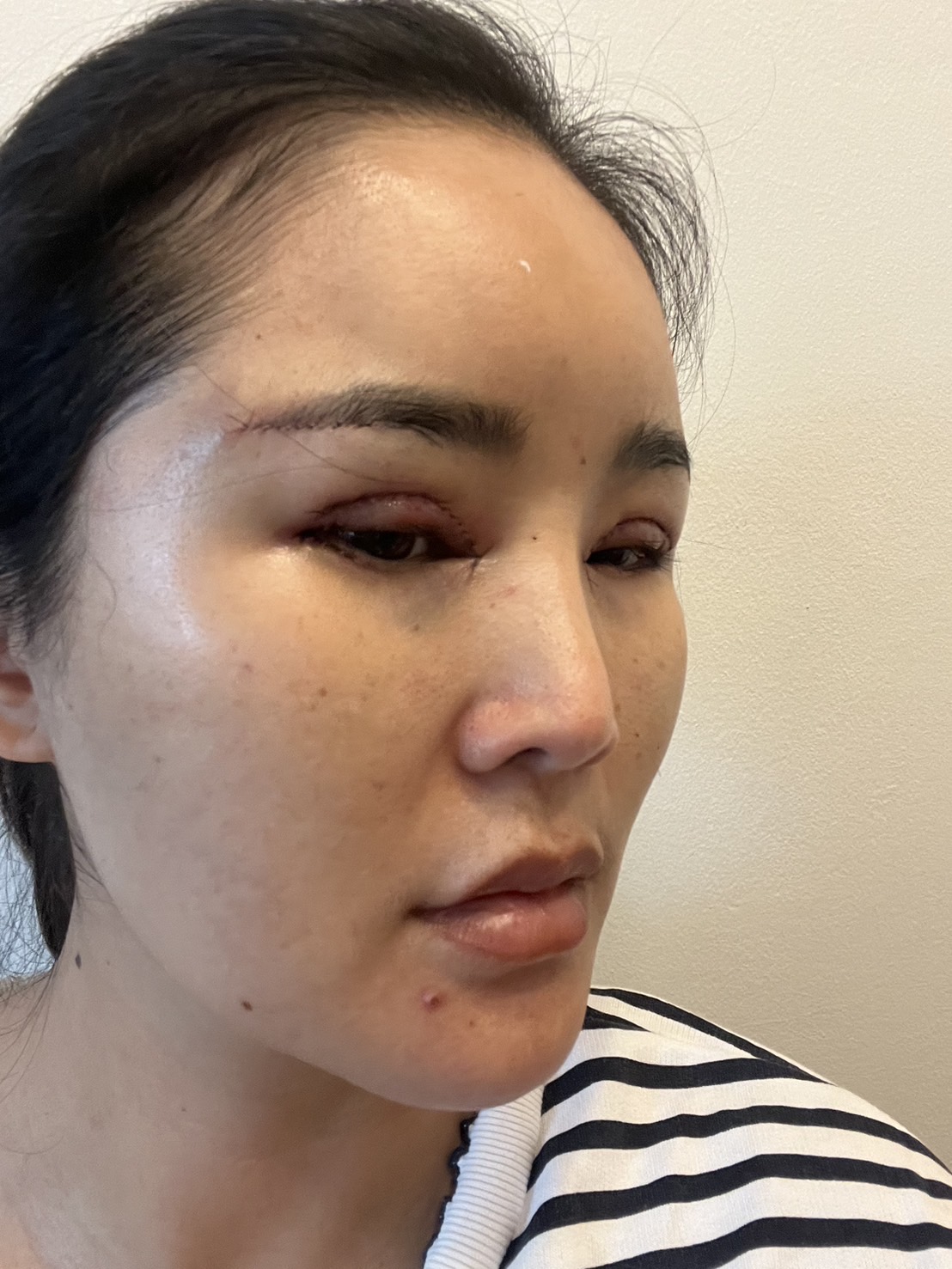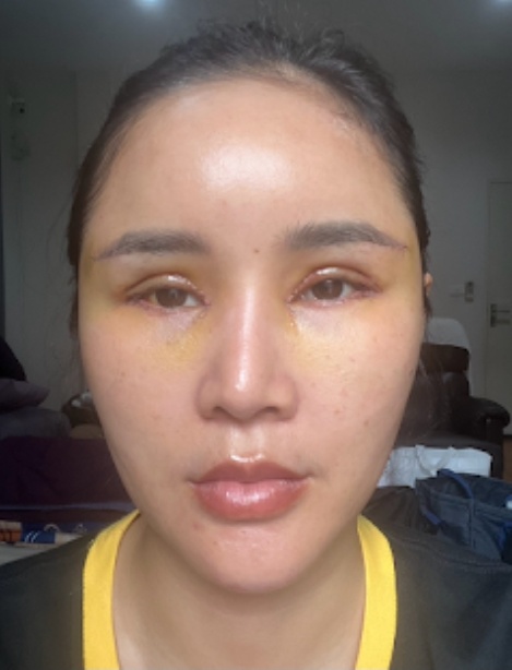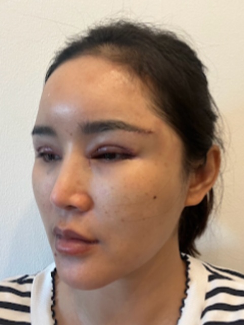 หลังทำเสร็จใหม่ ๆ จากภาพจะเห็นอาการบวมค่อนข้างชัด ซึ่งเป็นเรื่องปกติของการผ่าตัดหลายจุดพร้อมกัน แต่สิ่งที่เห็นได้ทันทีคือ ยกขึ้น หางตาเปิด และพื้นที่ดวงตาดูโล่งขึ้นอย่างชัดเจน แม้ยังบวมอยู่ แต่รูปตาโดยรวมดูยาวขึ้น และตาไม่ถูกกดเหมือนก่อนทำ ภาพนี้ทำให้รู้สึกว่าโครงสร้างตาถูกแก้ตรงจุดจริง ๆ