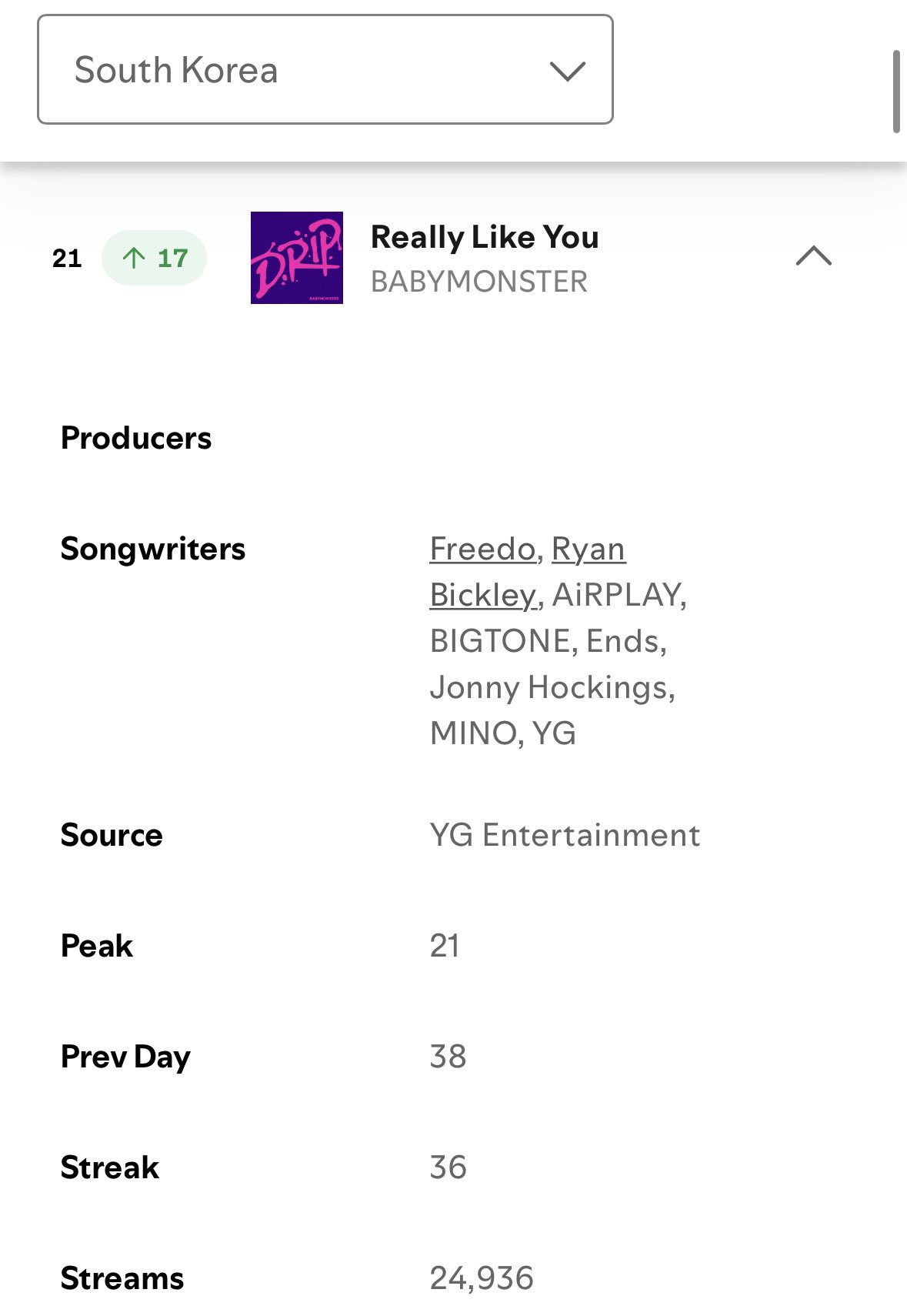 เพลง Really Like You คือเพลงที่ 3 ของ BABYMONSTER ที่อยู่อันดับ Top 10 บน Apple Music Korea Chart ต่อจาก SHEESH และ DRIP