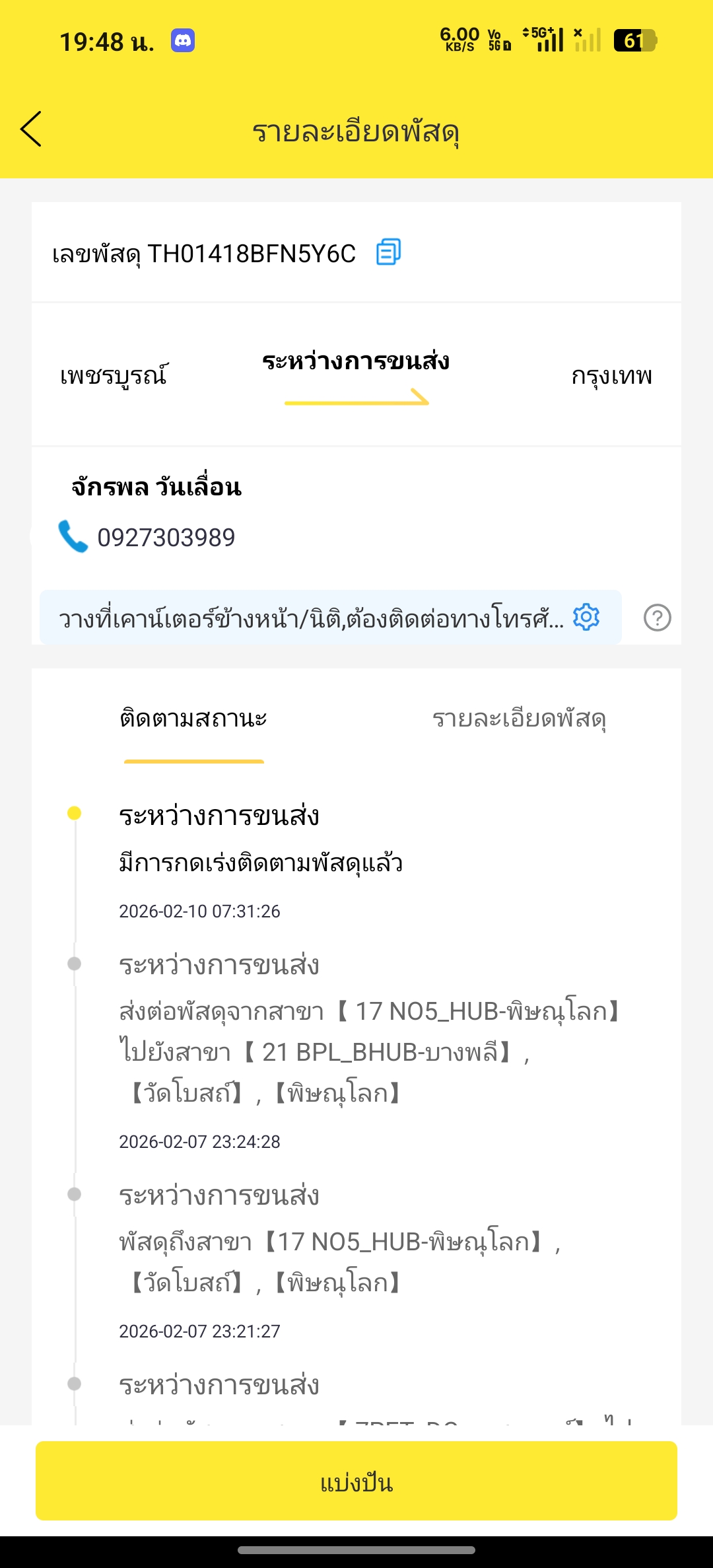 ตามหัวข้อข้างต้นได้ทำการส่งพัสดุพร้อมกัน2ชิ้นในที่อยู่เดียวกันในวันที่7/2/69 ตอนนี้วันที่10/2/69 ยังไม่ถึงปลายทางเลย ปกติไม่นานขนาดนี้ สงสัยว่ามีปัญหาอะไรรึเปล่าครับ TH01418BFN5Y6C