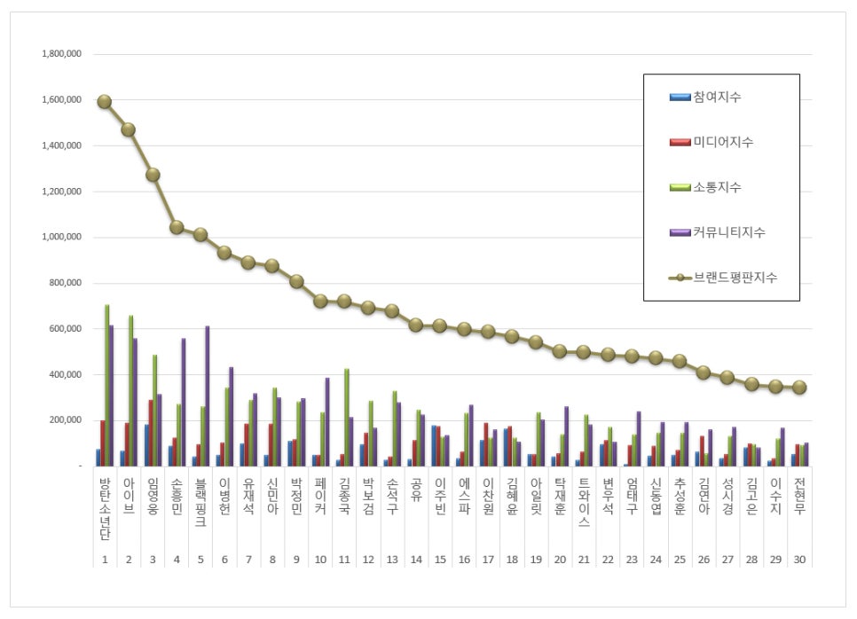 BTS ซึ่งอยู่อันดับหนึ่ง ทำคะแนนดัชนีชื่อเสียงแบรนด์ได้ 1,590,057 คะแนน ดัชนีการมีส่วนร่วมอยู่ที่ 72,112 คะแนน ดัชนีสื่ออยู่ที่ 197,639 คะแนน ดัชนีการสื่อสารอยู่ที่ 706,266 คะแนน และดัชนีชุมชนอยู่ที่ 614,039 คะแนน ซึ่งเพิ่มขึ้น 86.76% จากเดือนก่อนหน้า