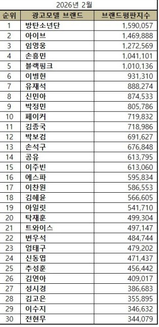 จากผลการวิเคราะห์ข้อมูลขนาดใหญ่เกี่ยวกับชื่อเสียงของแบรนด์รูปแบบการโฆษณาในเดือนกุมภาพันธ์ 2026 พบว่า BTS ครองอันดับหนึ่ง ตามมาด้วย Ive และ Lim Young-woong ในอันดับสองและสามตามลำดับ