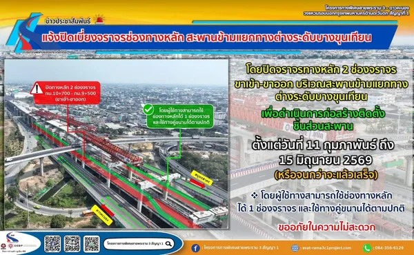 ช่วงที่ 2 : ขอแจ้งปิดเบี่ยงจราจรช่องทางหลัก บริเวณสะพานข้ามแยกทางต่างระดับบางขุนเทียน โดยปิดจราจรทางหลัก 2 ช่องจราจร (ขาเข้า-ขาออก) กม.9+500 - กม.10+700 เพื่อดำเนินการก่อสร้างติดตั้งชิ้นส่วนสะพาน ตั้งแต่วันที่ 11 กุมภาพันธ์ ถึง 15 มิถุนายน 2569 (หรือจนกว่าจะแล้วเสร็จ)