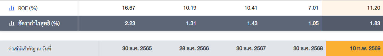 สังเกตุ ROE (%) ถือว่า ดีขึ้นกว่าปีก่อนมากค่ะ 11.20% (เกิน 10% ถือว่าใช้ได้ค่ะ) และตัวเลขนี้น่าจะขยับขึ้นอีกหน่อย เพราะข้อมูลยังไม่อัพเดท