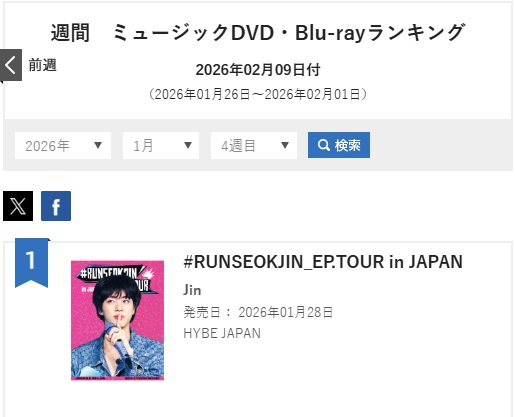 นอกจากนี้ บันทึกการแสดงสดแฟนคอนเสิร์ตที่ญี่ปุ่นของจิน “#RUNSEOKJIN_EP.TOUR in JAPAN” ยังคว้าอันดับ 1 พร้อมกันทั้งบนชาร์ต Oricon Weekly Blu-ray Ranking (รอบการเก็บข้อมูล: 26 มกราคม – 1 กุมภาพันธ์) และชาร์ต Weekly Music DVD·Blu-ray Ranking โดยคอนเสิร์ตในญี่ปุ่นครั้งนั้นได้รับความนิยมอย่างล้นหลาม โดยเฉพาะรอบที่จัดขึ้น ณ จังหวัดชิบะ และโอซาก้า เมื่อเดือนกรกฎาคมปีที่แล้ว ซึ่งบัตรขายหมดเกลี้ยงทุกรอบการแสดง โดยเฉพาะการแสดงที่ เคียวเซร่า โดม โอซาก้า ที่บัตรขายหมดลามไปถึงที่นั่งชั้น 8 และที่นั่งในมุมจำกัดการมองเห็น (Restricted-view seats) ซึ่งพิสูจน์ให้เห็นถึงพลังในการขายบัตรที่แข็งแกร่งของ BTS