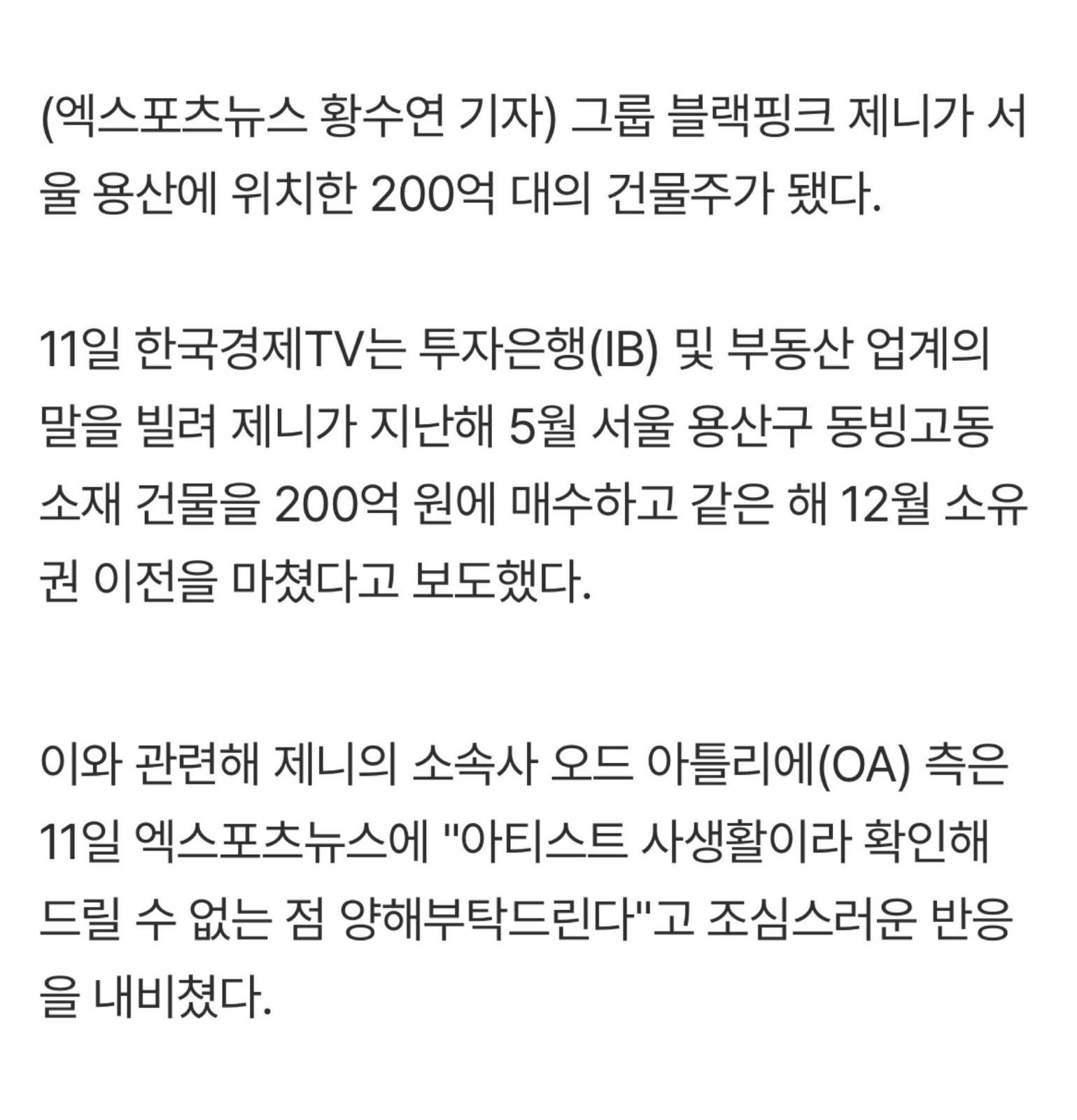 สื่อเกาหลีรายงานว่า JENNIE ได้ซื้ออาคารแห่งหนึ่งในเขตยงซานราคา 20,000 ล้านวอนด้วยเงินสด (ประมาณ 428 ล้านบาท)