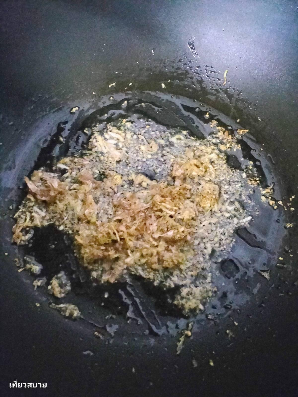 2. เตรียมสามเกลอ (รากผักชี กระเทียม พริกไทย ตำละเอียด) มาผัดให้หอม