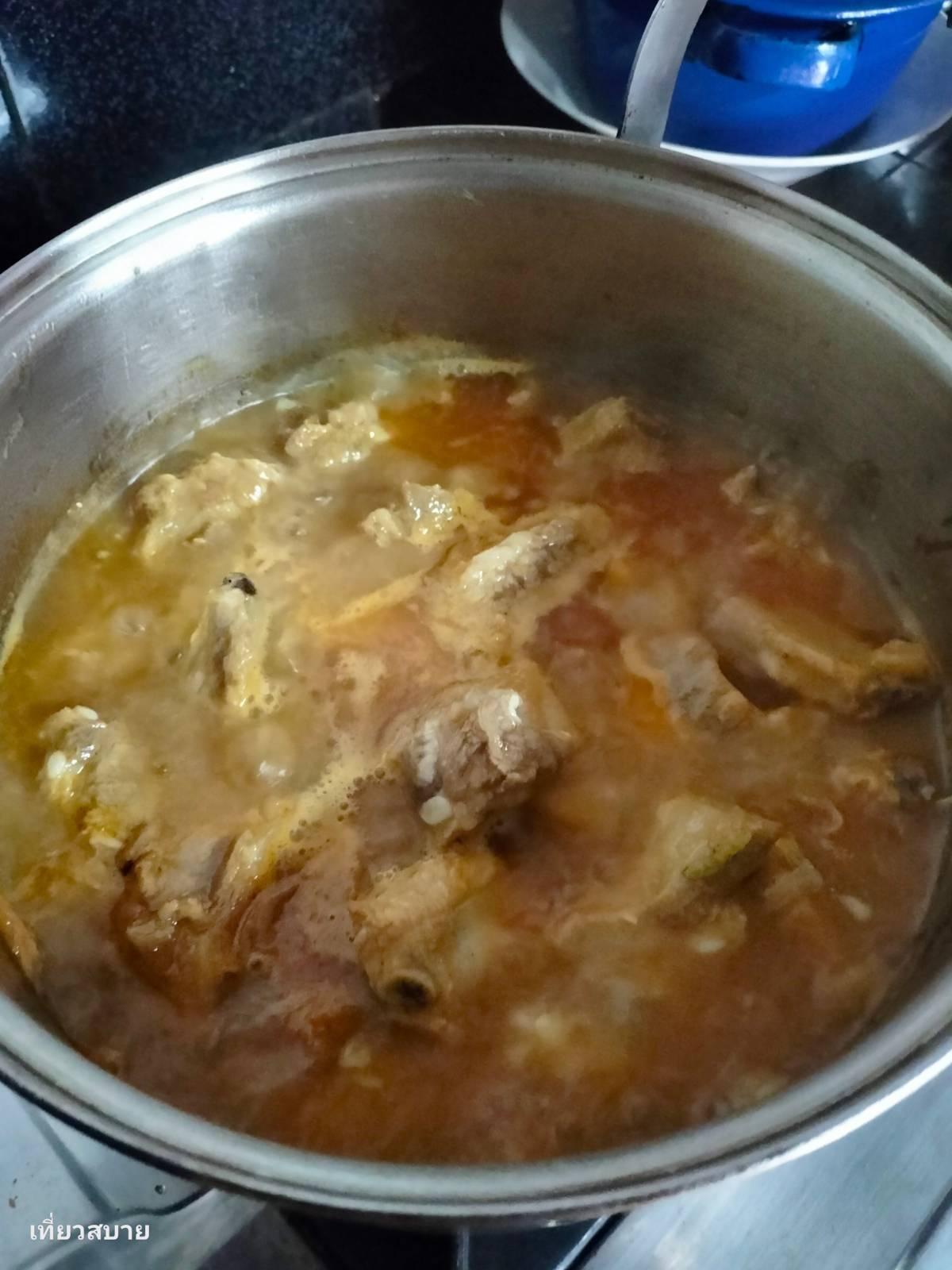 3.นำหมูลงไปรวนให้พอมีกลิ่นหอม ย้ายหมูลงหม้อตุ๋น เติมน้ำให้ท่วม แล้วใช้ไฟอ่อนเคี่ยวไปเรื่อยๆ ใจเย็นๆค่ะ ระหว่างนี้ถ้ามีฟองขาวๆ ให้หมั่นช้อนออกนะคะ น้ำซอสจะได้ใสสวยน่าทาน (ใช้เวลาเคี่ยวประมาณ 35-45 นาที)
