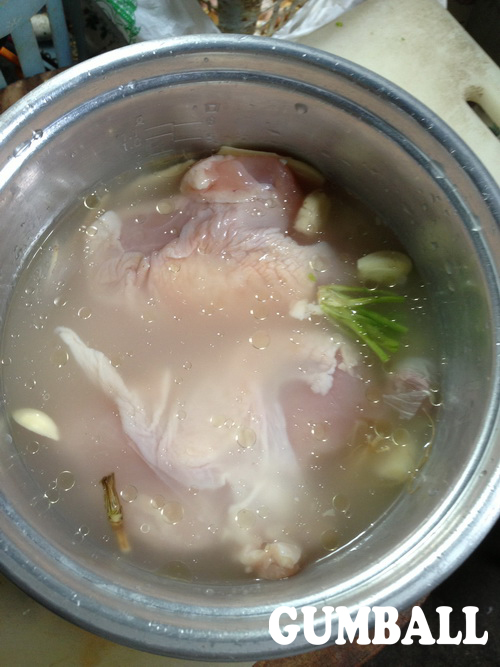 ลงไปด้วย เกลือนิดหน่อย รากผักชี กระเทียม ขิง แต่ถ้าไม่มี ใส่ผงสามเกลอ ลงไปแทนได้ค่ะ บางทีเพื่อนอยู่หอไม่สะดวก