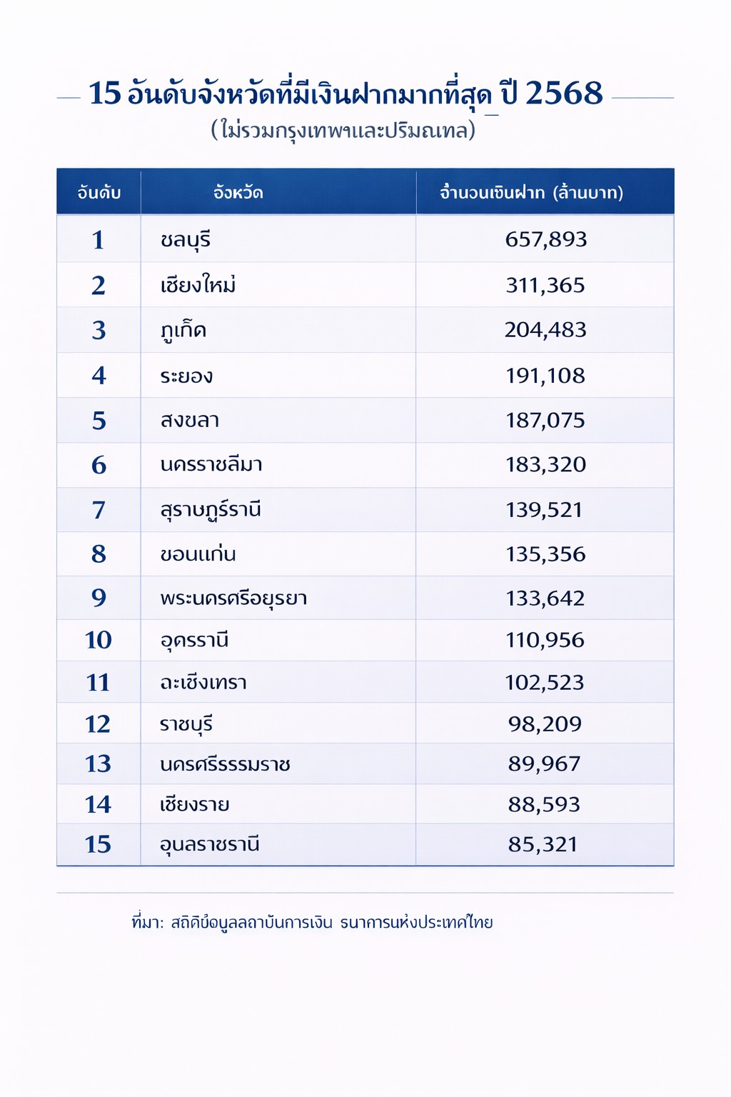 15 อันดับจังหวัดที่มี "เงินฝากมากที่สุด" ปี 2568