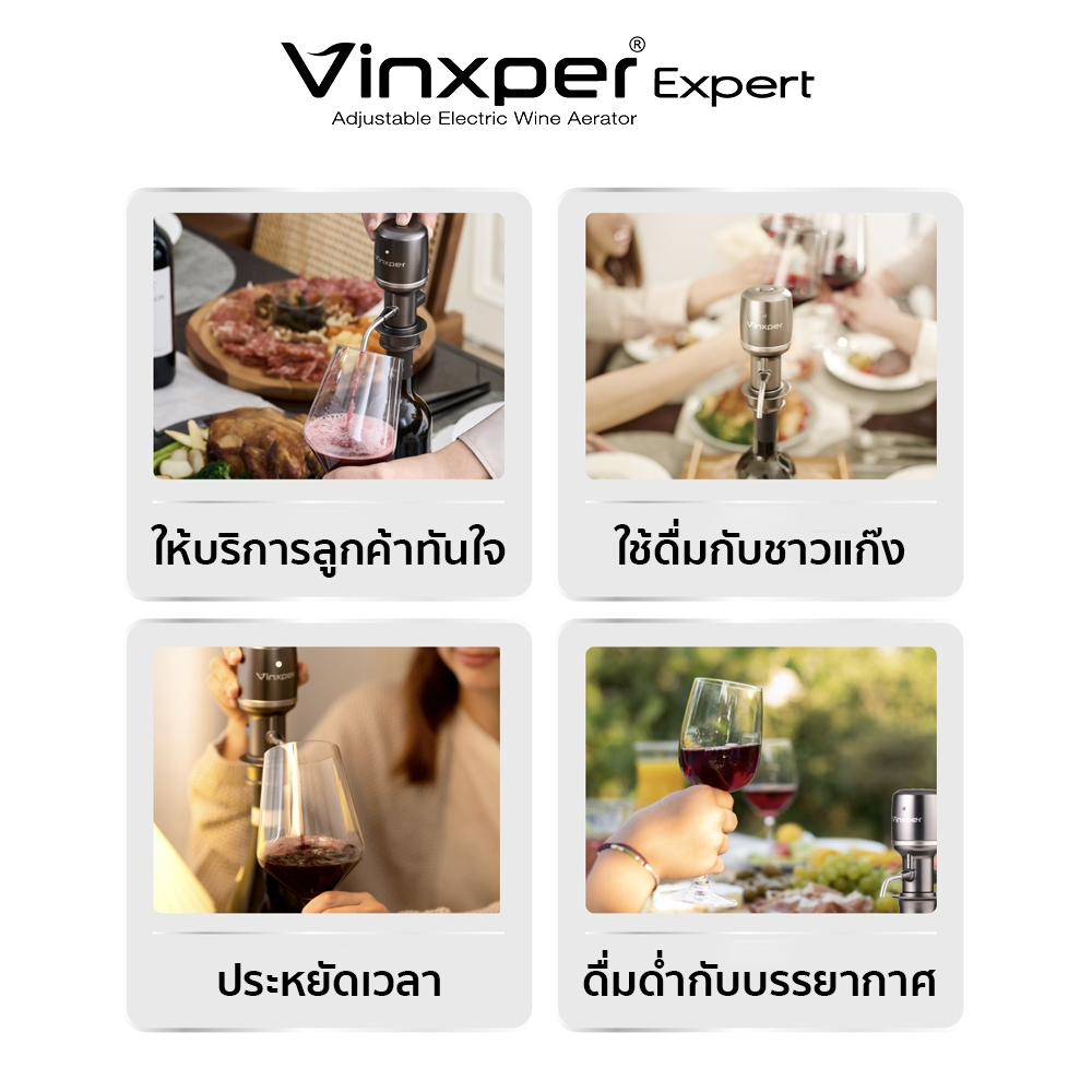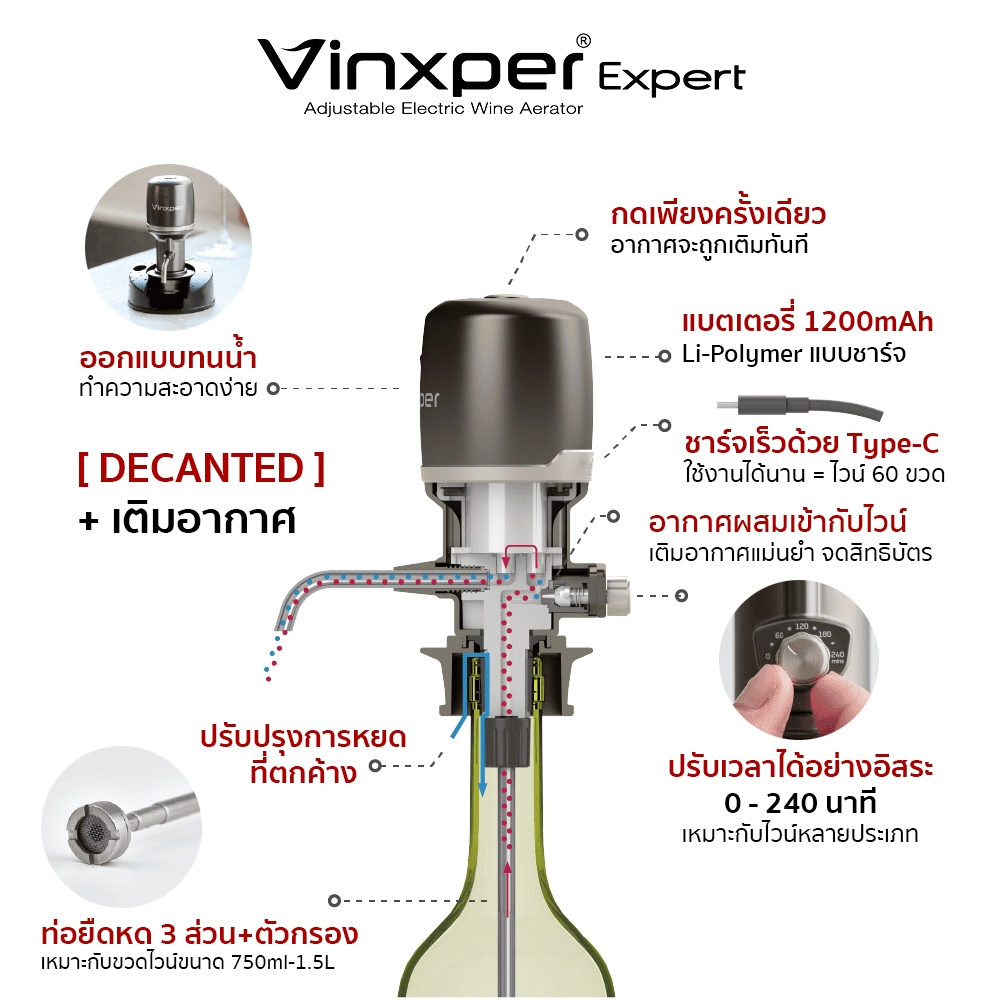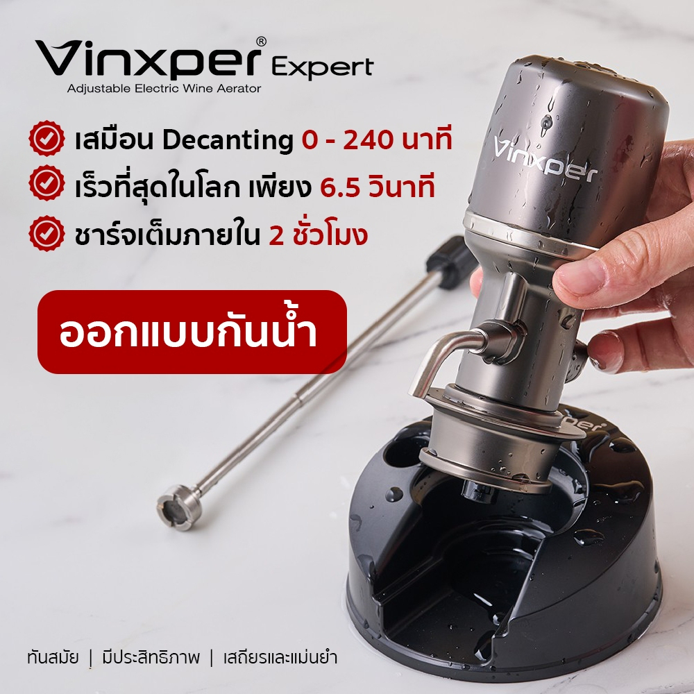 ถ้าอยากให้ไวน์เปิดกลิ่นหอมและรสนุ่มขึ้นแบบไม่ต้องรอนาน เครื่องเติมอากาศไวน์ไฟฟ้า Vinxper รุ่น Expert Edition VX8-U ช่วยปรับเวลา Decanting ได้ 0-240 นาที (4 ชั่วโมง) เลือกสไตล์รสชาติได้ละเอียดตามชนิดไวน์ ใช้กับขวด 0.75/1.5L ได้ และเทไวน์ 1 แก้ว 4 ออนซ์ (128 มล.) ใช้เพียง 6.5 วินาที 🍷