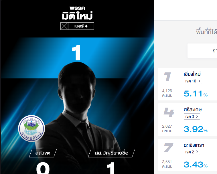 เช่น พรรคมิติใหม่ เบอร์ 4 (สส เขตได้ 1200 สส บช ได้ 230,000 ) ดูย่อยไป ตามภาพ