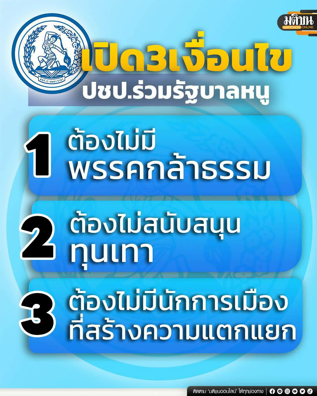 “หลักๆก็มี 3 ข้อครับ คือ ถ้าไม่มีพรรคกล้าธรรม ร่วมด้วยก็ค่อยมาคุยในหลักการกัน เราไม่ได้ปิดประตูเสียทีเดียวนะครับ”แหล่งข่าว กล่าว...