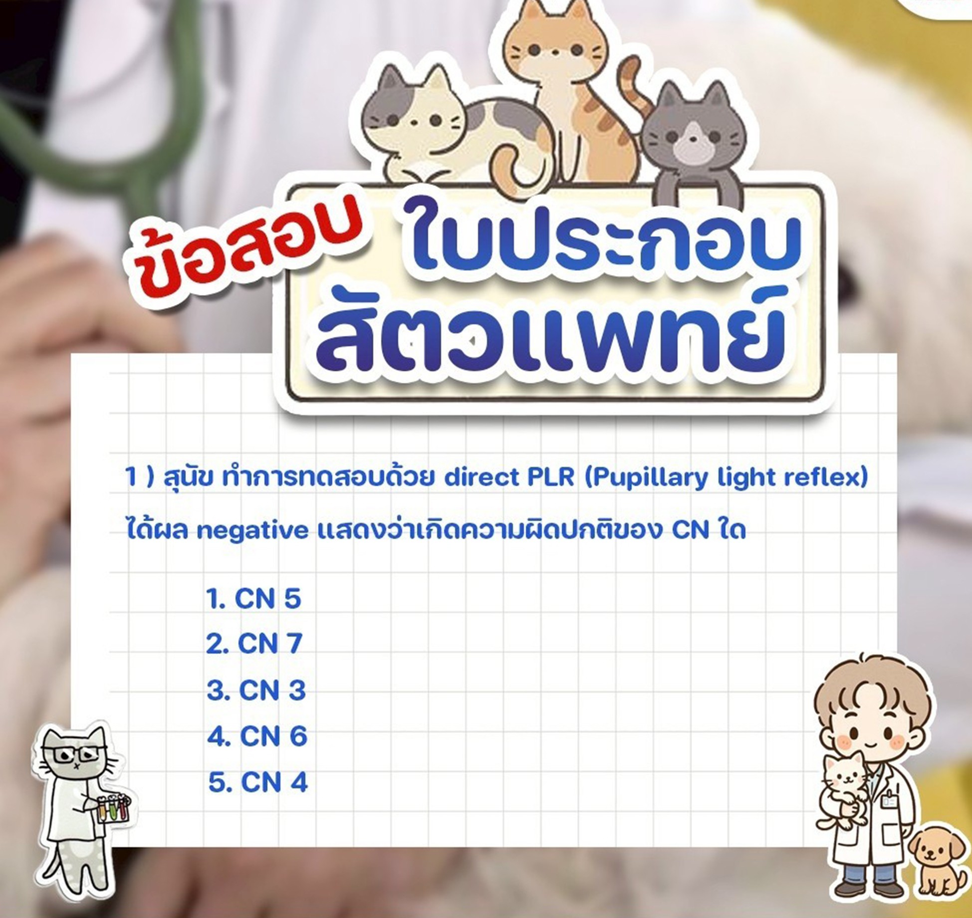 1. เช็กระบบประสาทน้องหมา ทดสอบ Direct PLR แล้วผลเป็น Negative ความผิดปกติอยู่ที่ CN ไหน? (เฉลยคือ CN 3 Oculomotor นะจ๊ะ เพราะคุมการหดรูม่านตาโดยตรง! )