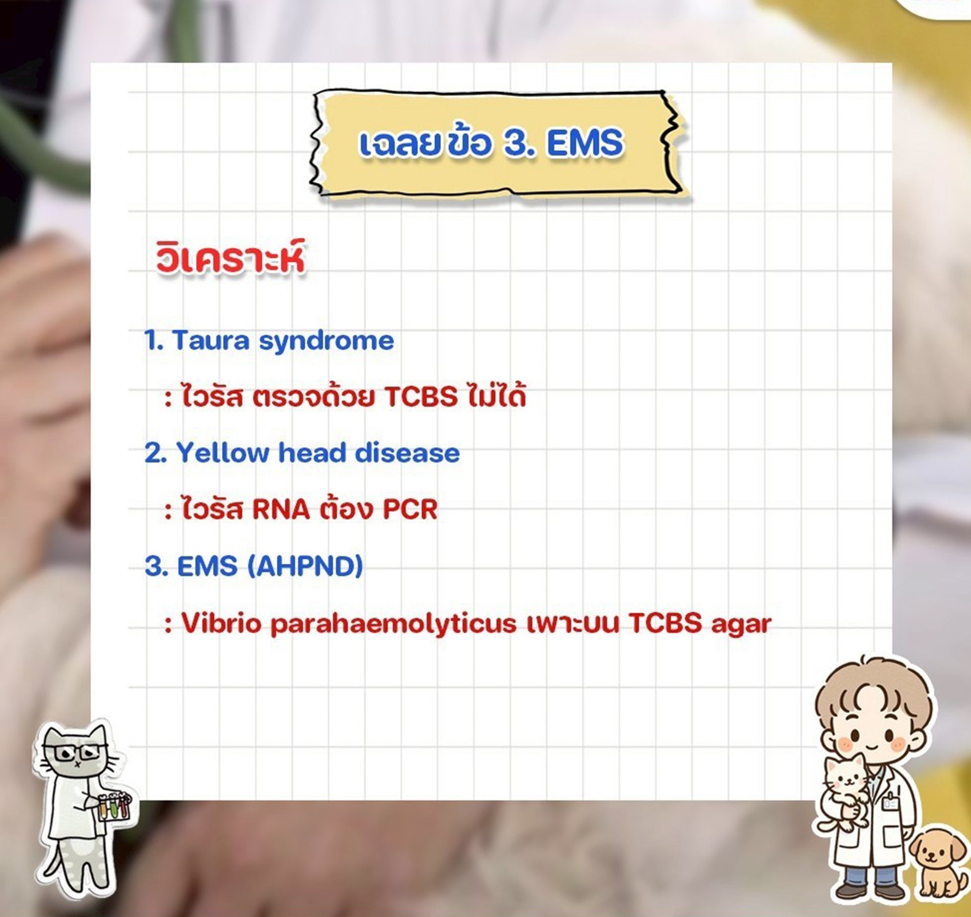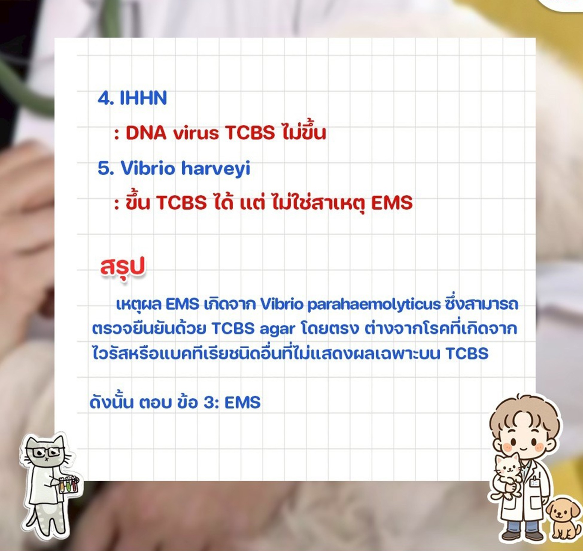 2. ตรวจโรคกุ้งทะเล อาหารเลี้ยงเชื้อ TCBS agar ใช้ยืนยันโรคอะไร? (คำตอบคือ EMS เพราะเจ้าเชื้อ Vibrio parahaemolyticus เขาชอบแบบนี้!)