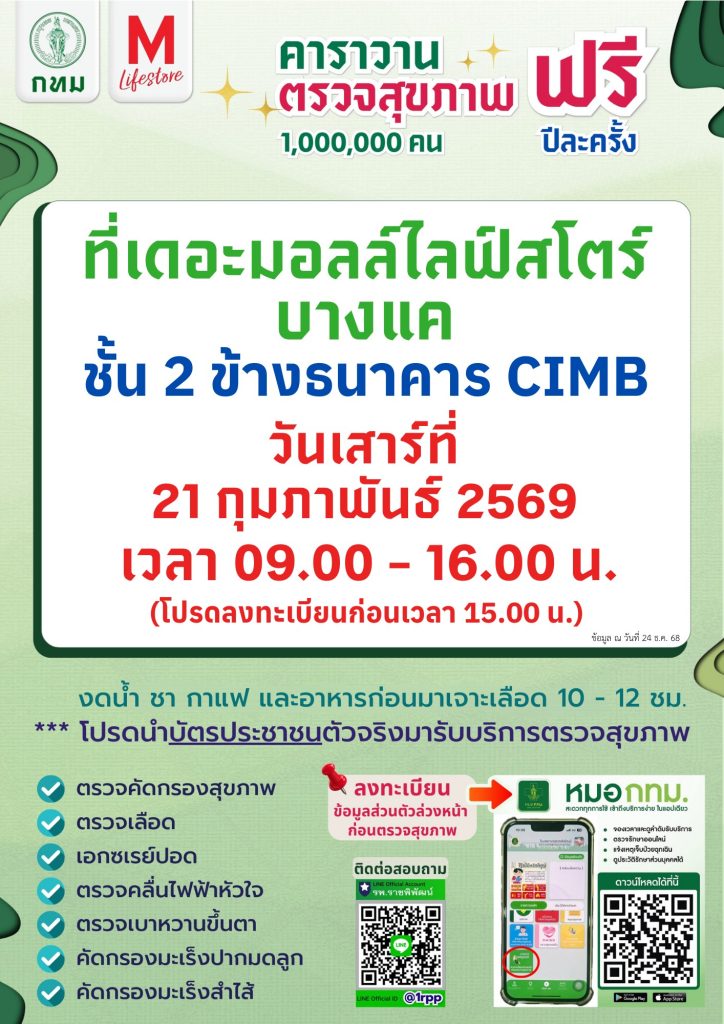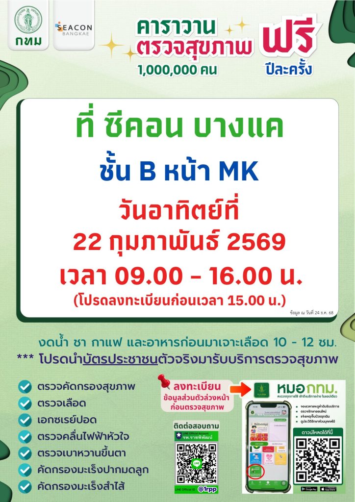 ตรวจสุขภาพฟรีของ กทม. 21กพ.69 ที่เดอะมอลล์บางแค 22กพ. 69 ซีคอนบางแคค่ะ