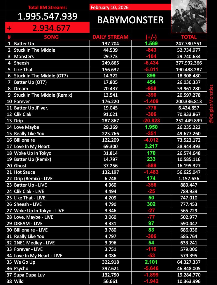 Babymonster มีเพลงที่ยอดสตรีมเกิน 200 ล้านอยู่ 4 เพลง โดยมีเพลงล่าสุดคือ Forever ที่ทำยอดเกินได้ร่วมกับ Batter up, Sheesh, Drip