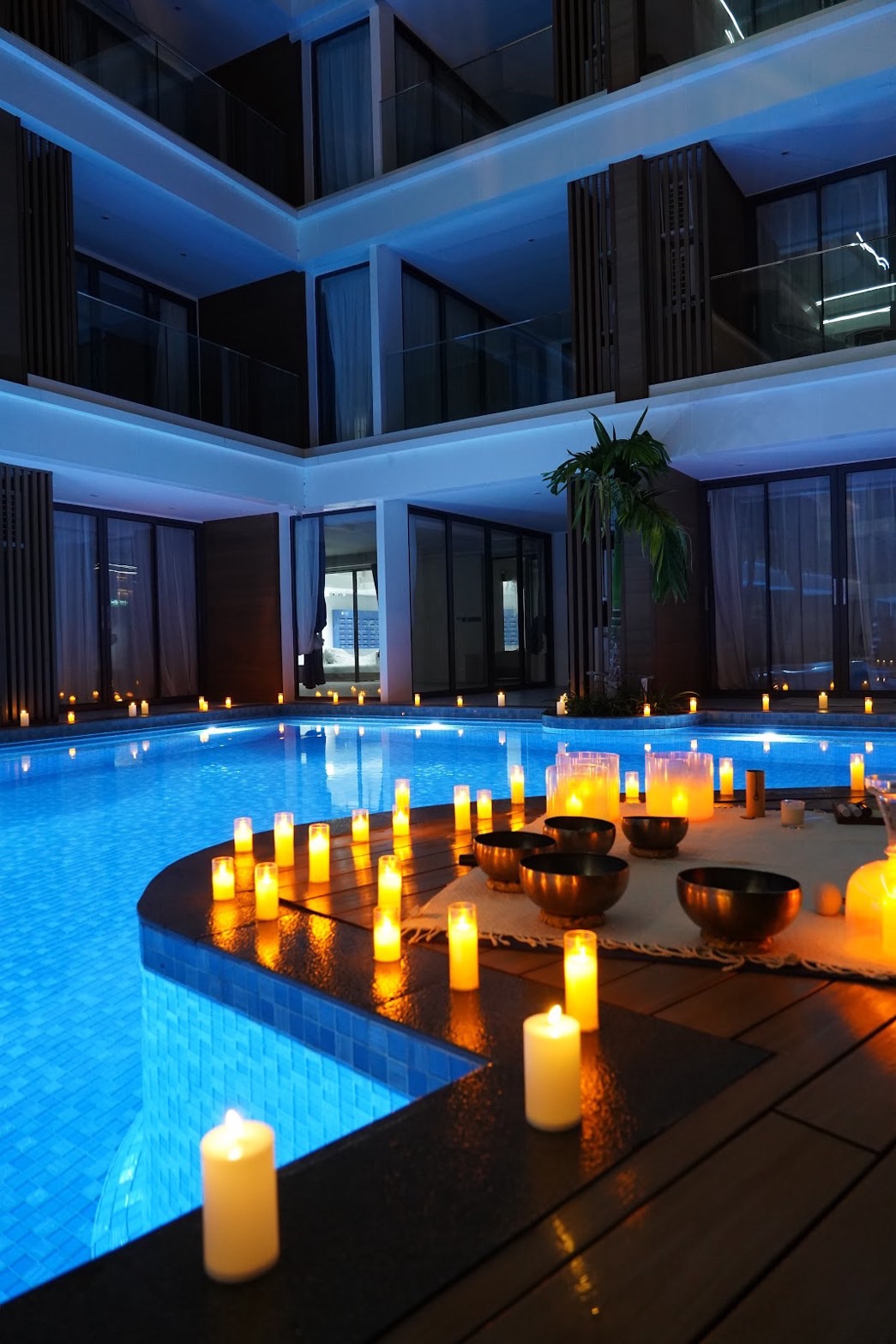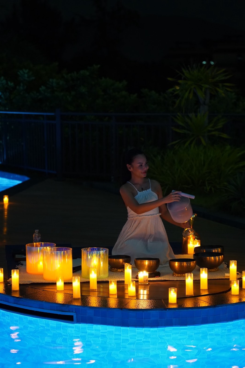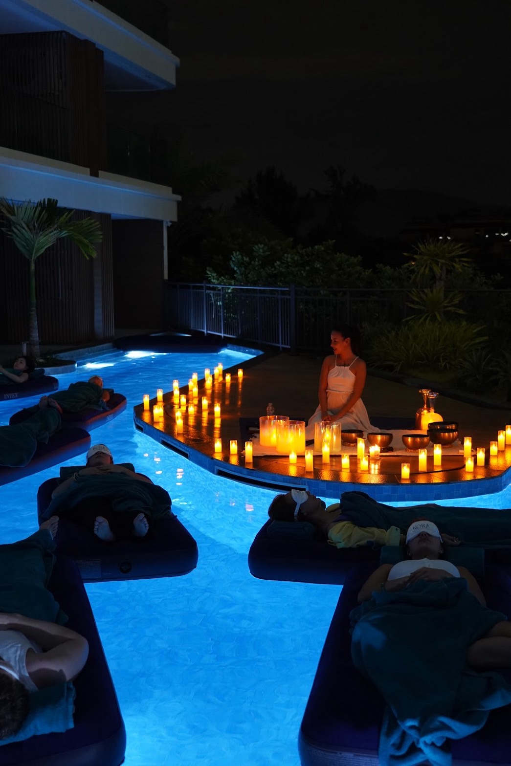 พอถึงเวลา เค้าจัดกิจกรรมตรงสระว่ายน้ำ กลางคืนที่ลมอุ่น ๆ พัด มีจุดเทียนวางรายรอบ สะท้อนแสงลง